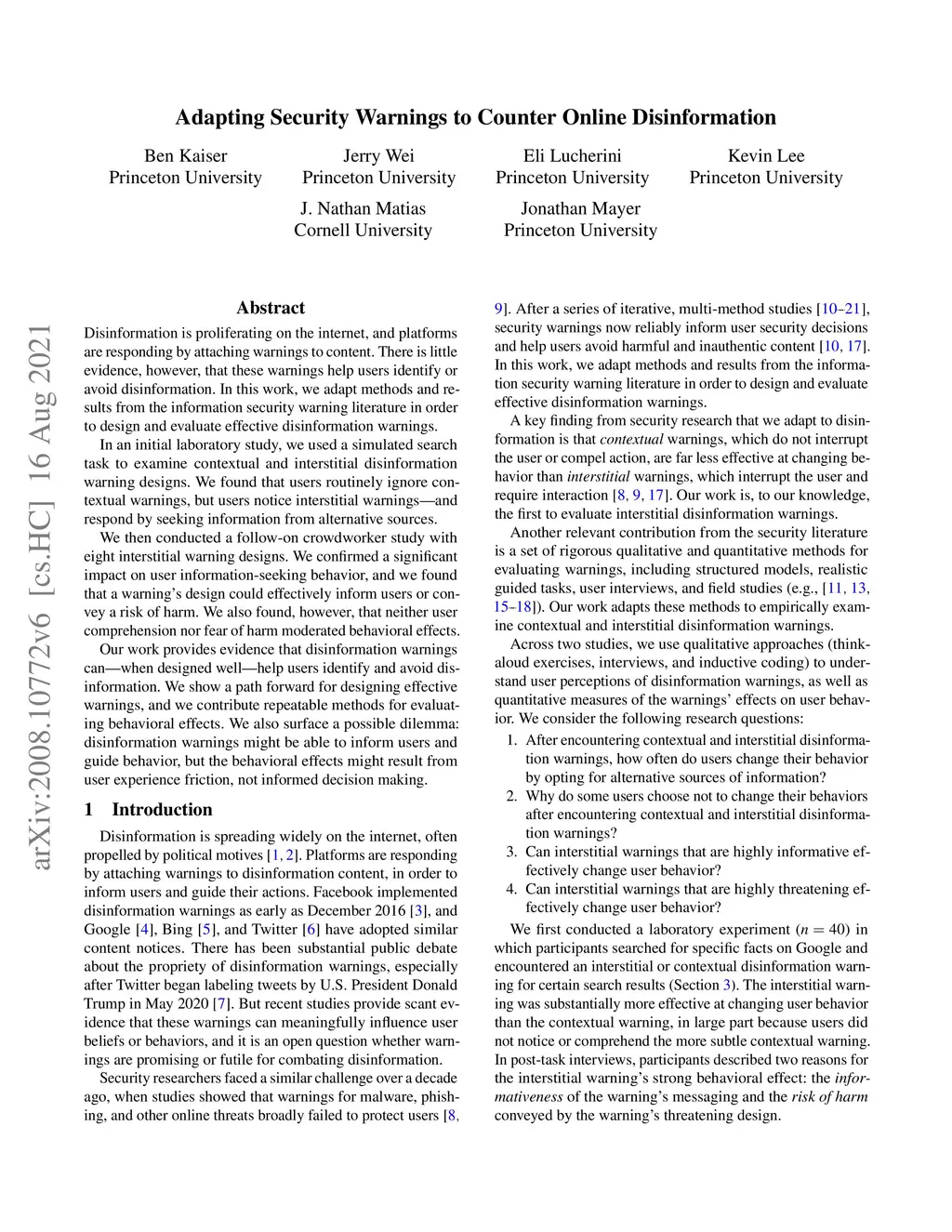Disinformation is proliferating on the internet, and platforms are responding by attaching warnings to content. There is little evidence, however, that these warnings help users identify or avoid disinformation. In this work, we adapt methods and results from the information security warning literature in order to design and evaluate effective disinformation warnings. In an initial laboratory study, we used a simulated search task to examine contextual and interstitial disinformation warning designs. We found that users routinely ignore contextual warnings, but users notice interstitial warnings -- and respond by seeking information from alternative sources. We then conducted a follow-on crowdworker study with eight interstitial warning designs. We confirmed a significant impact on user information-seeking behavior, and we found that a warning's design could effectively inform users or convey a risk of harm. We also found, however, that neither user comprehension nor fear of harm moderated behavioral effects. Our work provides evidence that disinformation warnings can -- when designed well -- help users identify and avoid disinformation. We show a path forward for designing effective warnings, and we contribute repeatable methods for evaluating behavioral effects. We also surface a possible dilemma: disinformation warnings might be able to inform users and guide behavior, but the behavioral effects might result from user experience friction, not informed decision making.