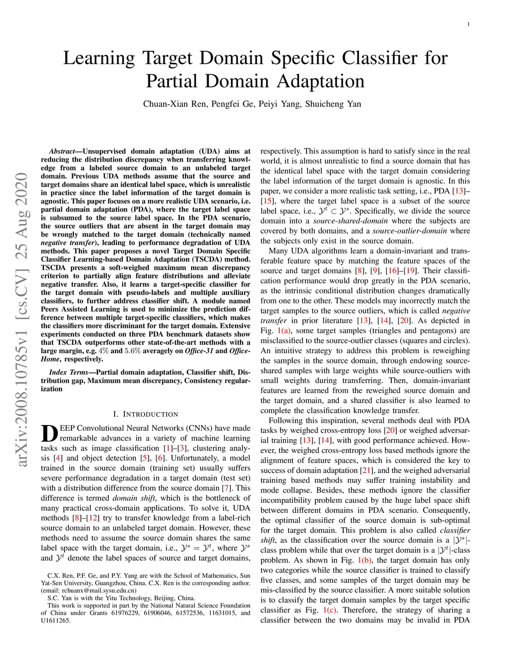 Unsupervised domain adaptation~(UDA) aims at reducing the distribution discrepancy when transferring knowledge from a labeled source domain to an unlabeled target domain. Previous UDA methods assume that the source and target domains share an identical label space, which is unrealistic in practice since the label information of the target domain is agnostic. This paper focuses on a more realistic UDA scenario, i.e. partial domain adaptation (PDA), where the target label space is subsumed to the source label space. In the PDA scenario, the source outliers that are absent in the target domain may be wrongly matched to the target domain (technically named negative transfer), leading to performance degradation of UDA methods. This paper proposes a novel Target Domain Specific Classifier Learning-based Domain Adaptation (TSCDA) method. TSCDA presents a soft-weighed maximum mean discrepancy criterion to partially align feature distributions and alleviate negative transfer. Also, it learns a target-specific classifier for the target domain with pseudo-labels and multiple auxiliary classifiers, to further address classifier shift. A module named Peers Assisted Learning is used to minimize the prediction difference between multiple target-specific classifiers, which makes the classifiers more discriminant for the target domain. Extensive experiments conducted on three PDA benchmark datasets show that TSCDA outperforms other state-of-the-art methods with a large margin, e.g. and averagely on Office-31 and Office-Home, respectively.