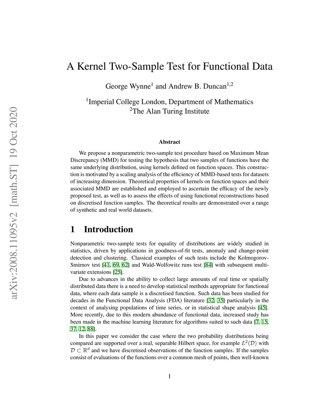 We propose a nonparametric two-sample test procedure based on Maximum Mean Discrepancy (MMD) for testing the hypothesis that two samples of functions have the same underlying distribution, using kernels defined on function spaces. This construction is motivated by a scaling analysis of the efficiency of MMD-based tests for datasets of increasing dimension. Theoretical properties of kernels on function spaces and their associated MMD are established and employed to ascertain the efficacy of the newly proposed test, as well as to assess the effects of using functional reconstructions based on discretised function samples. The theoretical results are demonstrated over a range of synthetic and real world datasets.