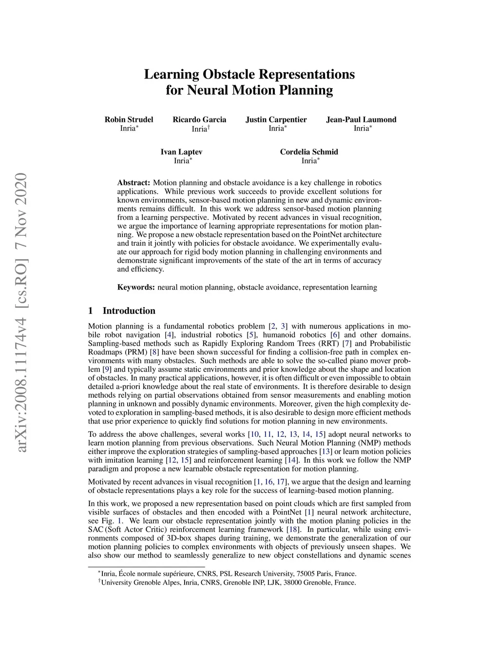 Motion planning and obstacle avoidance is a key challenge in robotics applications. While previous work succeeds to provide excellent solutions for known environments, sensor-based motion planning in new and dynamic environments remains difficult. In this work we address sensor-based motion planning from a learning perspective. Motivated by recent advances in visual recognition, we argue the importance of learning appropriate representations for motion planning. We propose a new obstacle representation based on the PointNet architecture and train it jointly with policies for obstacle avoidance. We experimentally evaluate our approach for rigid body motion planning in challenging environments and demonstrate significant improvements of the state of the art in terms of accuracy and efficiency.