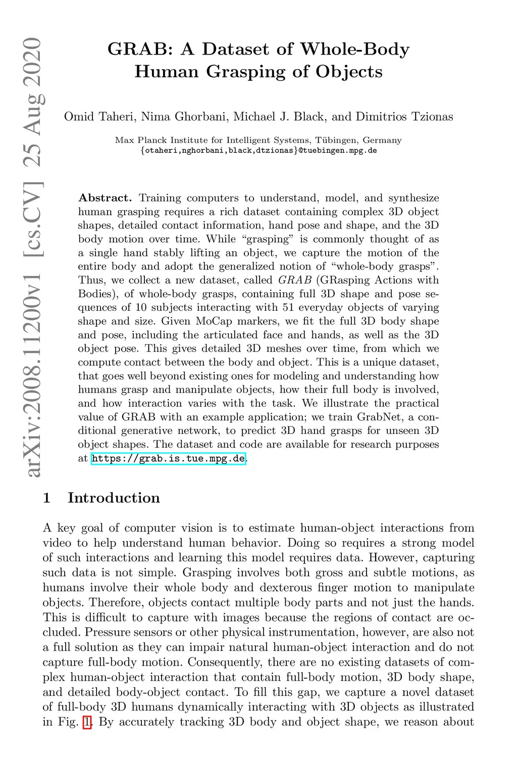 Training computers to understand, model, and synthesize human grasping requires a rich dataset containing complex 3D object shapes, detailed contact information, hand pose and shape, and the 3D body motion over time. While "grasping" is commonly thought of as a single hand stably lifting an object, we capture the motion of the entire body and adopt the generalized notion of "whole-body grasps". Thus, we collect a new dataset, called GRAB (GRasping Actions with Bodies), of whole-body grasps, containing full 3D shape and pose sequences of 10 subjects interacting with 51 everyday objects of varying shape and size. Given MoCap markers, we fit the full 3D body shape and pose, including the articulated face and hands, as well as the 3D object pose. This gives detailed 3D meshes over time, from which we compute contact between the body and object. This is a unique dataset, that goes well beyond existing ones for modeling and understanding how humans grasp and manipulate objects, how their full body is involved, and how interaction varies with the task. We illustrate the practical value of GRAB with an example application; we train GrabNet, a conditional generative network, to predict 3D hand grasps for unseen 3D object shapes. The dataset and code are available for research purposes at https://grab.is.tue.mpg.de.