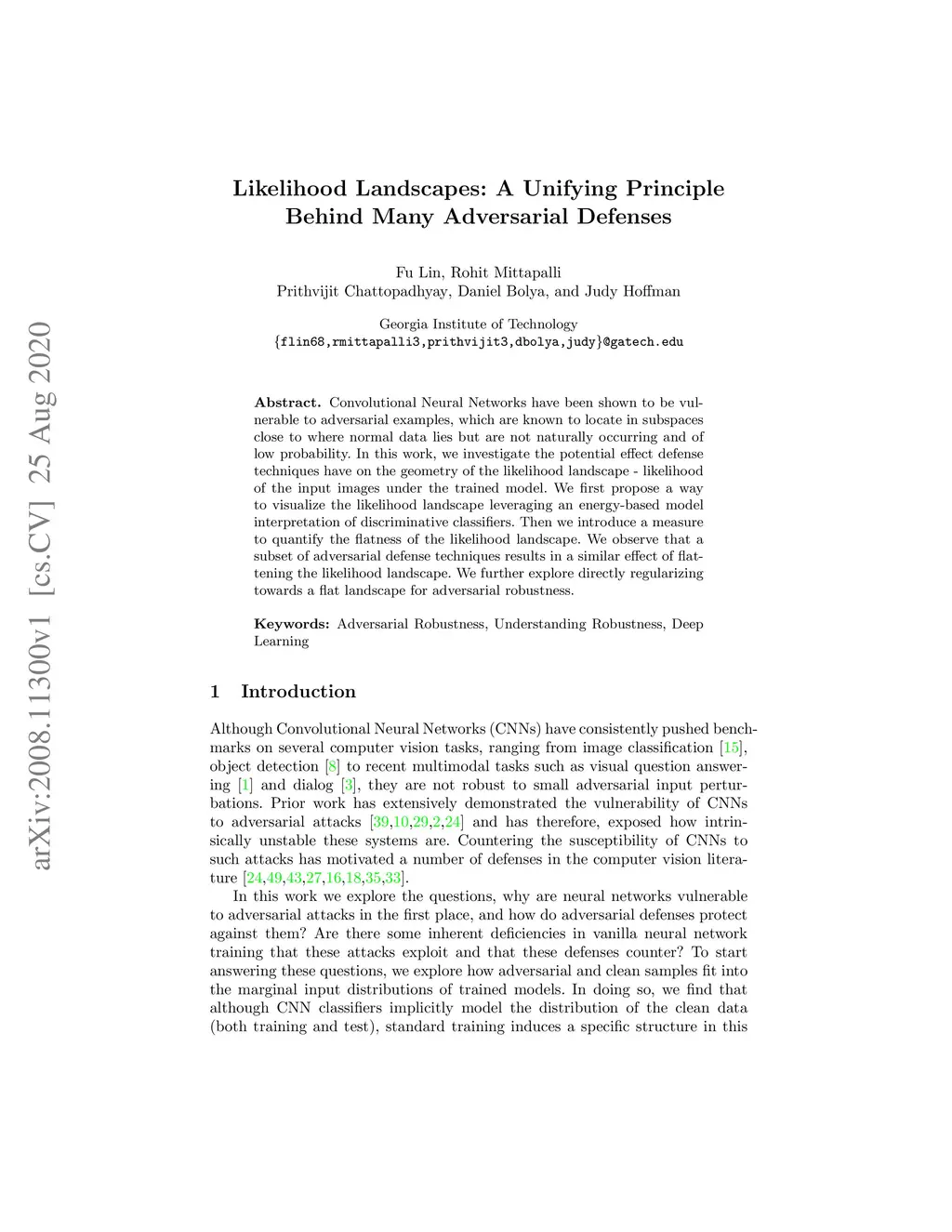 Convolutional Neural Networks have been shown to be vulnerable to adversarial examples, which are known to locate in subspaces close to where normal data lies but are not naturally occurring and of low probability. In this work, we investigate the potential effect defense techniques have on the geometry of the likelihood landscape - likelihood of the input images under the trained model. We first propose a way to visualize the likelihood landscape leveraging an energy-based model interpretation of discriminative classifiers. Then we introduce a measure to quantify the flatness of the likelihood landscape. We observe that a subset of adversarial defense techniques results in a similar effect of flattening the likelihood landscape. We further explore directly regularizing towards a flat landscape for adversarial robustness.
