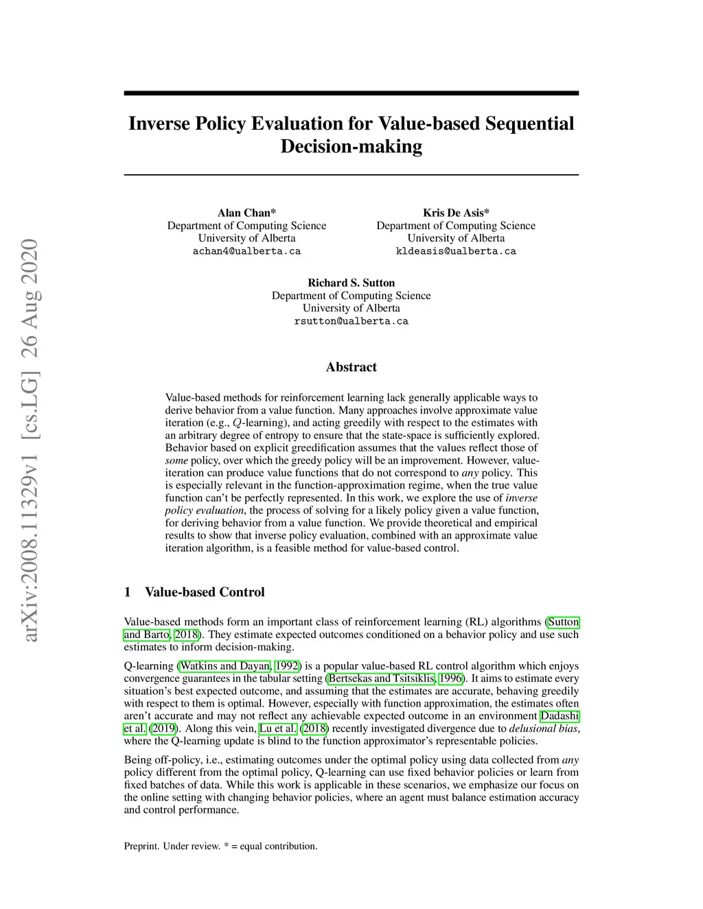 Value-based methods for reinforcement learning lack generally applicable ways to derive behavior from a value function. Many approaches involve approximate value iteration (e.g., -learning), and acting greedily with respect to the estimates with an arbitrary degree of entropy to ensure that the state-space is sufficiently explored. Behavior based on explicit greedification assumes that the values reflect those of \textit{some} policy, over which the greedy policy will be an improvement. However, value-iteration can produce value functions that do not correspond to \textit{any} policy. This is especially relevant in the function-approximation regime, when the true value function can't be perfectly represented. In this work, we explore the use of \textit{inverse policy evaluation}, the process of solving for a likely policy given a value function, for deriving behavior from a value function. We provide theoretical and empirical results to show that inverse policy evaluation, combined with an approximate value iteration algorithm, is a feasible method for value-based control.