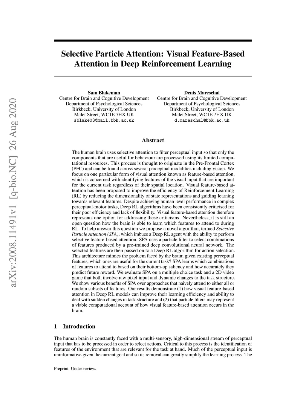 The human brain uses selective attention to filter perceptual input so that only the components that are useful for behaviour are processed using its limited computational resources. We focus on one particular form of visual attention known as feature-based attention, which is concerned with identifying features of the visual input that are important for the current task regardless of their spatial location. Visual feature-based attention has been proposed to improve the efficiency of Reinforcement Learning (RL) by reducing the dimensionality of state representations and guiding learning towards relevant features. Despite achieving human level performance in complex perceptual-motor tasks, Deep RL algorithms have been consistently criticised for their poor efficiency and lack of flexibility. Visual feature-based attention therefore represents one option for addressing these criticisms. Nevertheless, it is still an open question how the brain is able to learn which features to attend to during RL. To help answer this question we propose a novel algorithm, termed Selective Particle Attention (SPA), which imbues a Deep RL agent with the ability to perform selective feature-based attention. SPA learns which combinations of features to attend to based on their bottom-up saliency and how accurately they predict future reward. We evaluate SPA on a multiple choice task and a 2D video game that both involve raw pixel input and dynamic changes to the task structure. We show various benefits of SPA over approaches that naively attend to either all or random subsets of features. Our results demonstrate (1) how visual feature-based attention in Deep RL models can improve their learning efficiency and ability to deal with sudden changes in task structure and (2) that particle filters may represent a viable computational account of how visual feature-based attention occurs in the brain.