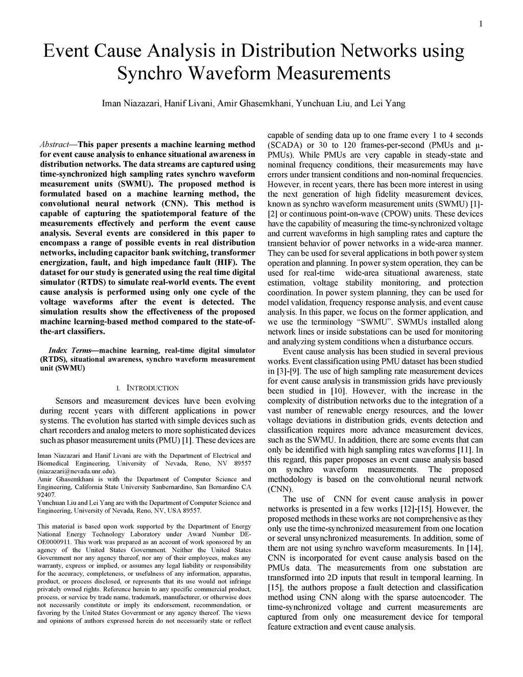 This paper presents a machine learning method for event cause analysis to enhance situational awareness in distribution networks. The data streams are captured using time-synchronized high sampling rates synchro waveform measurement units (SWMU). The proposed method is formulated based on a machine learning method, the convolutional neural network (CNN). This method is capable of capturing the spatiotemporal feature of the measurements effectively and perform the event cause analysis. Several events are considered in this paper to encompass a range of possible events in real distribution networks, including capacitor bank switching, transformer energization, fault, and high impedance fault (HIF). The dataset for our study is generated using the real-time digital simulator (RTDS) to simulate real-world events. The event cause analysis is performed using only one cycle of the voltage waveforms after the event is detected. The simulation results show the effectiveness of the proposed machine learning-based method compared to the state-of-the-art classifiers.