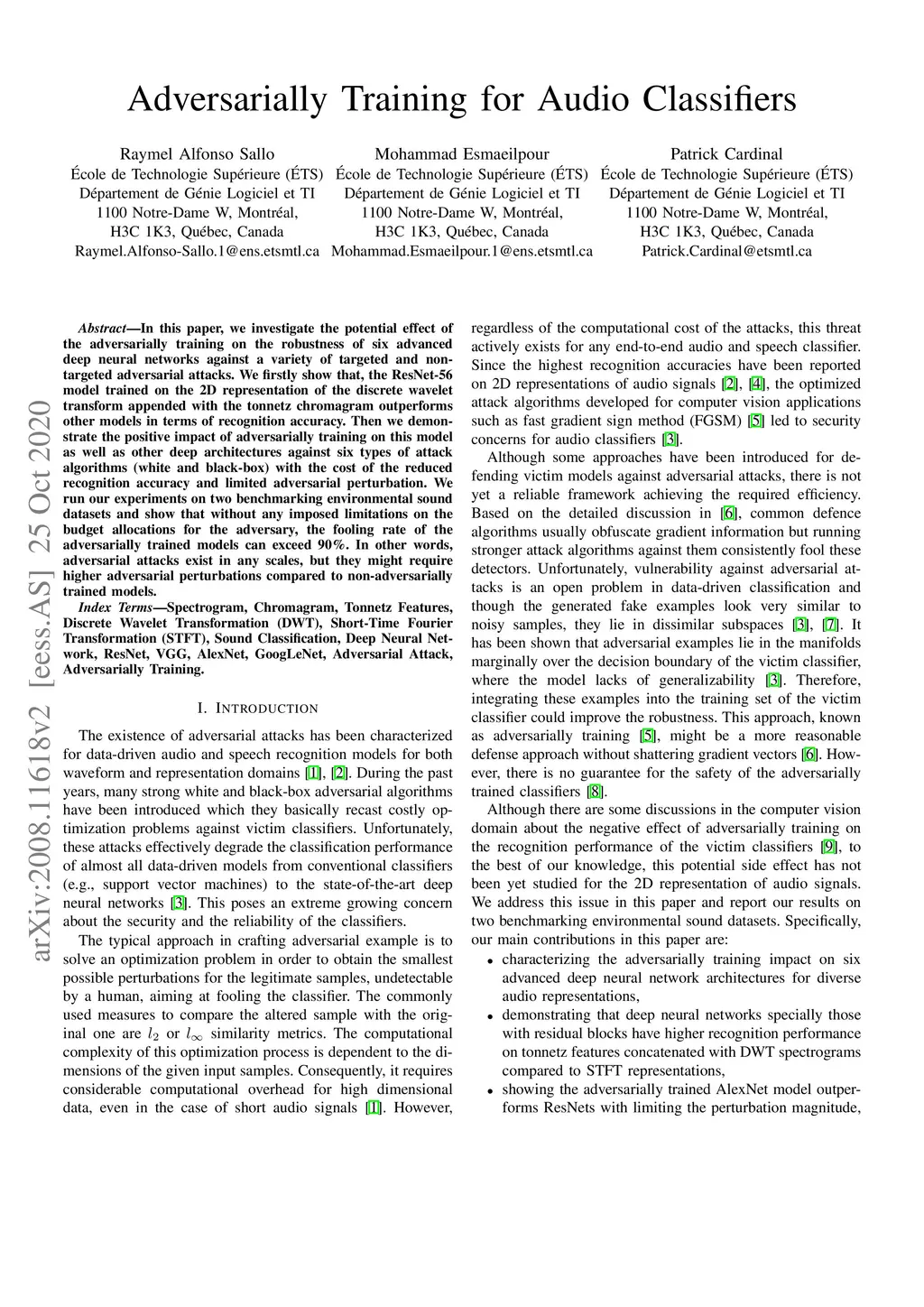 In this paper, we investigate the potential effect of the adversarially training on the robustness of six advanced deep neural networks against a variety of targeted and non-targeted adversarial attacks. We firstly show that, the ResNet-56 model trained on the 2D representation of the discrete wavelet transform appended with the tonnetz chromagram outperforms other models in terms of recognition accuracy. Then we demonstrate the positive impact of adversarially training on this model as well as other deep architectures against six types of attack algorithms (white and black-box) with the cost of the reduced recognition accuracy and limited adversarial perturbation. We run our experiments on two benchmarking environmental sound datasets and show that without any imposed limitations on the budget allocations for the adversary, the fooling rate of the adversarially trained models can exceed 90\%. In other words, adversarial attacks exist in any scales, but they might require higher adversarial perturbations compared to non-adversarially trained models.