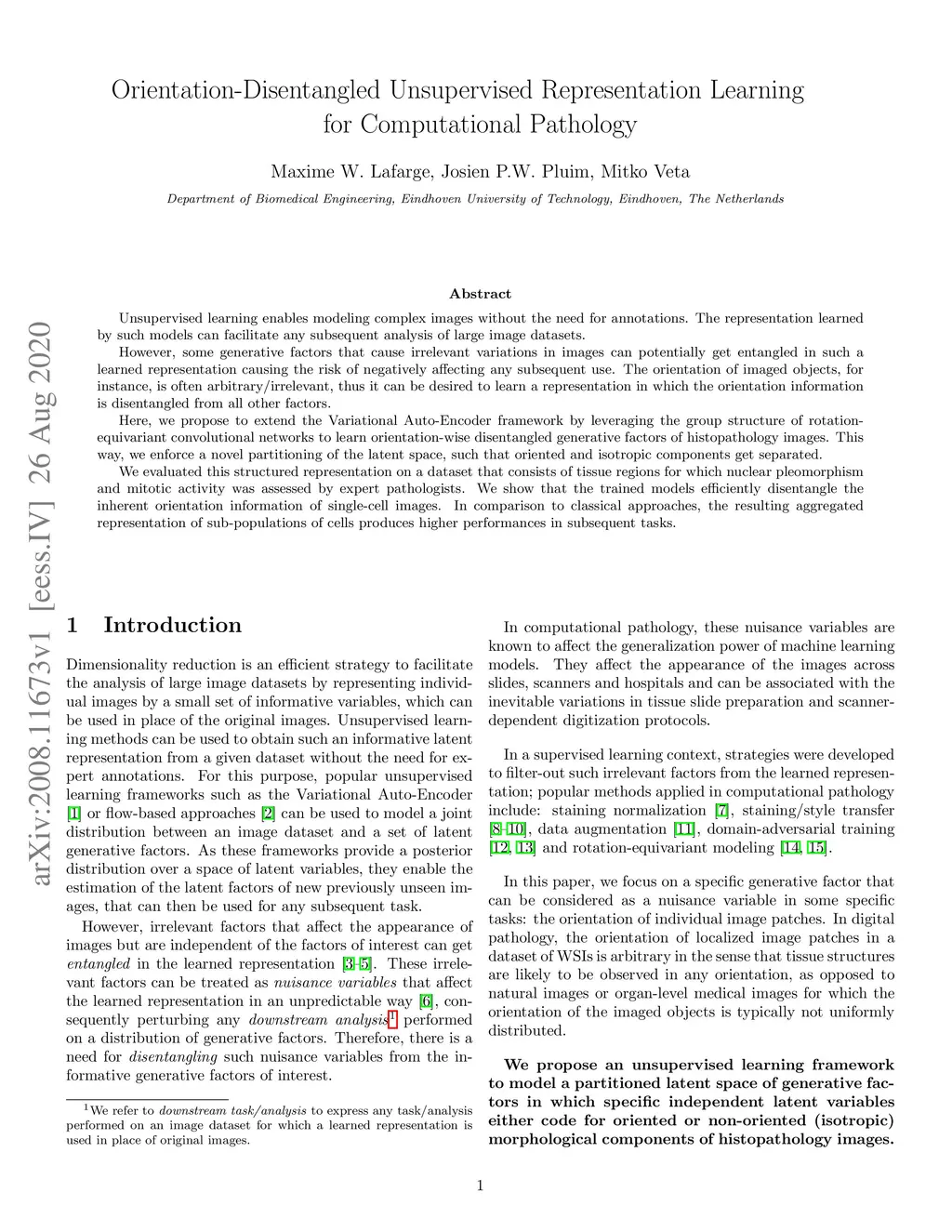 Unsupervised learning enables modeling complex images without the need for annotations. The representation learned by such models can facilitate any subsequent analysis of large image datasets. However, some generative factors that cause irrelevant variations in images can potentially get entangled in such a learned representation causing the risk of negatively affecting any subsequent use. The orientation of imaged objects, for instance, is often arbitrary/irrelevant, thus it can be desired to learn a representation in which the orientation information is disentangled from all other factors. Here, we propose to extend the Variational Auto-Encoder framework by leveraging the group structure of rotation-equivariant convolutional networks to learn orientation-wise disentangled generative factors of histopathology images. This way, we enforce a novel partitioning of the latent space, such that oriented and isotropic components get separated. We evaluated this structured representation on a dataset that consists of tissue regions for which nuclear pleomorphism and mitotic activity was assessed by expert pathologists. We show that the trained models efficiently disentangle the inherent orientation information of single-cell images. In comparison to classical approaches, the resulting aggregated representation of sub-populations of cells produces higher performances in subsequent tasks.
