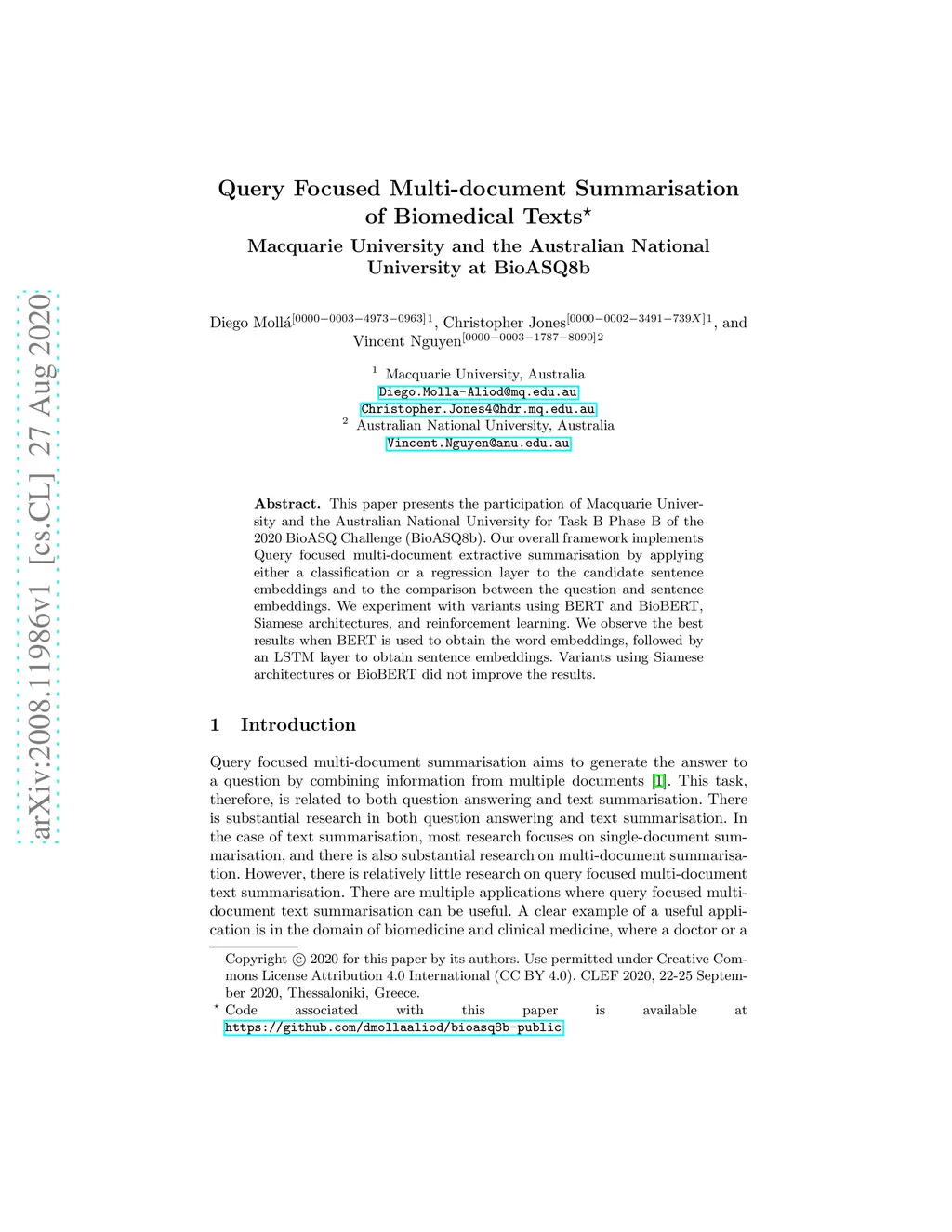This paper presents the participation of Macquarie University and the Australian National University for Task B Phase B of the 2020 BioASQ Challenge (BioASQ8b). Our overall framework implements Query focused multi-document extractive summarisation by applying either a classification or a regression layer to the candidate sentence embeddings and to the comparison between the question and sentence embeddings. We experiment with variants using BERT and BioBERT, Siamese architectures, and reinforcement learning. We observe the best results when BERT is used to obtain the word embeddings, followed by an LSTM layer to obtain sentence embeddings. Variants using Siamese architectures or BioBERT did not improve the results.