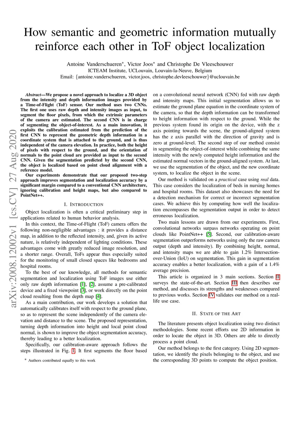 We propose a novel approach to localize a 3D object from the intensity and depth information images provided by a Time-of-Flight (ToF) sensor. Our method uses two CNNs. The first one uses raw depth and intensity images as input, to segment the floor pixels, from which the extrinsic parameters of the camera are estimated. The second CNN is in charge of segmenting the object-of-interest. As a main innovation, it exploits the calibration estimated from the prediction of the first CNN to represent the geometric depth information in a coordinate system that is attached to the ground, and is thus independent of the camera elevation. In practice, both the height of pixels with respect to the ground, and the orientation of normals to the point cloud are provided as input to the second CNN. Given the segmentation predicted by the second CNN, the object is localized based on point cloud alignment with a reference model. Our experiments demonstrate that our proposed two-step approach improves segmentation and localization accuracy by a significant margin compared to a conventional CNN architecture, ignoring calibration and height maps, but also compared to PointNet++.