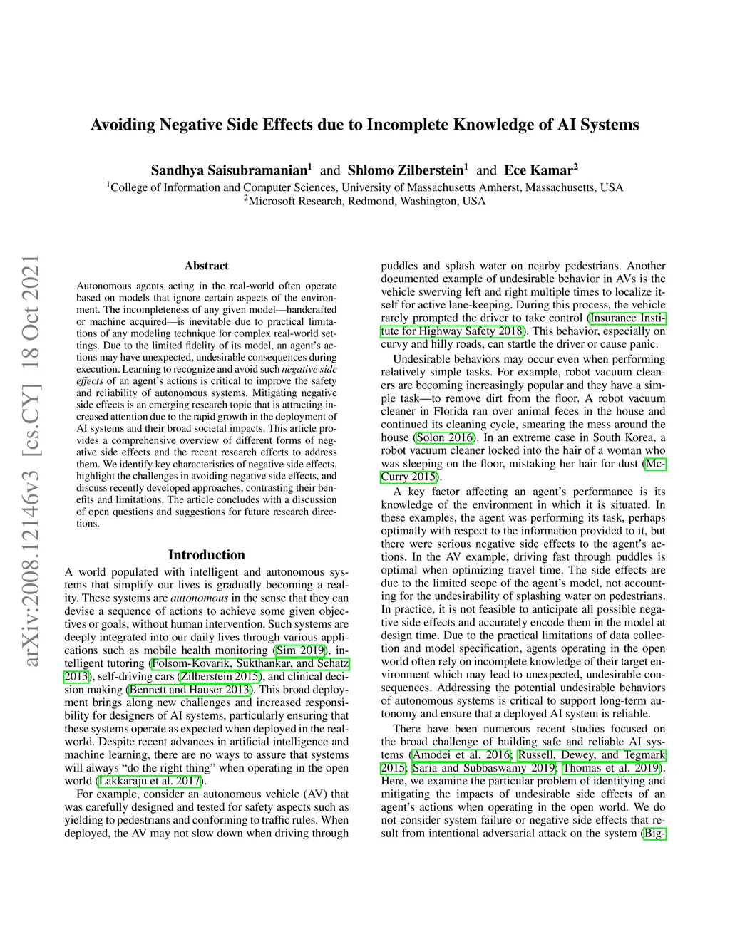 Autonomous agents acting in the real-world often operate based on models that ignore certain aspects of the environment. The incompleteness of any given model -- handcrafted or machine acquired -- is inevitable due to practical limitations of any modeling technique for complex real-world settings. Due to the limited fidelity of its model, an agent's actions may have unexpected, undesirable consequences during execution. Learning to recognize and avoid such negative side effects of an agent's actions is critical to improve the safety and reliability of autonomous systems. Mitigating negative side effects is an emerging research topic that is attracting increased attention due to the rapid growth in the deployment of AI systems and their broad societal impacts. This article provides a comprehensive overview of different forms of negative side effects and the recent research efforts to address them. We identify key characteristics of negative side effects, highlight the challenges in avoiding negative side effects, and discuss recently developed approaches, contrasting their benefits and limitations. The article concludes with a discussion of open questions and suggestions for future research directions.