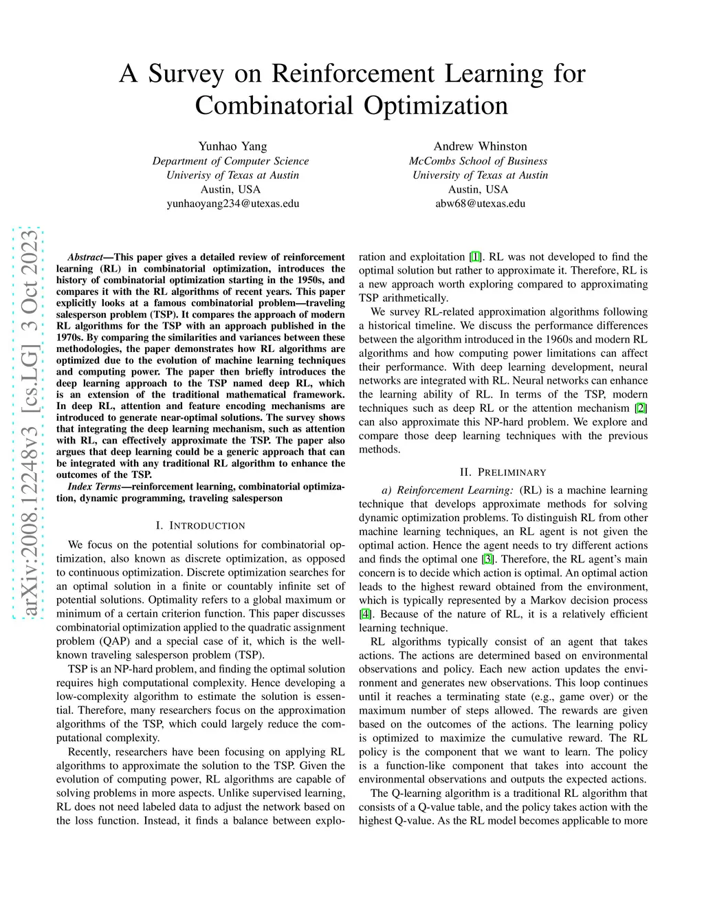 This paper gives a detailed review of reinforcement learning in combinatorial optimization, introduces the history of combinatorial optimization starting in the 1960s, and compares with the reinforcement learning algorithms in recent years. We explicitly look at a famous combinatorial problem known as the Traveling Salesman Problem. We compare the approach of the modern reinforcement learning algorithms on Traveling Salesman Problem with the approach published in the 1970s. Then, we discuss the similarities between these algorithms and how the approach of reinforcement learning changes due to the evolution of machine learning techniques and computing power.