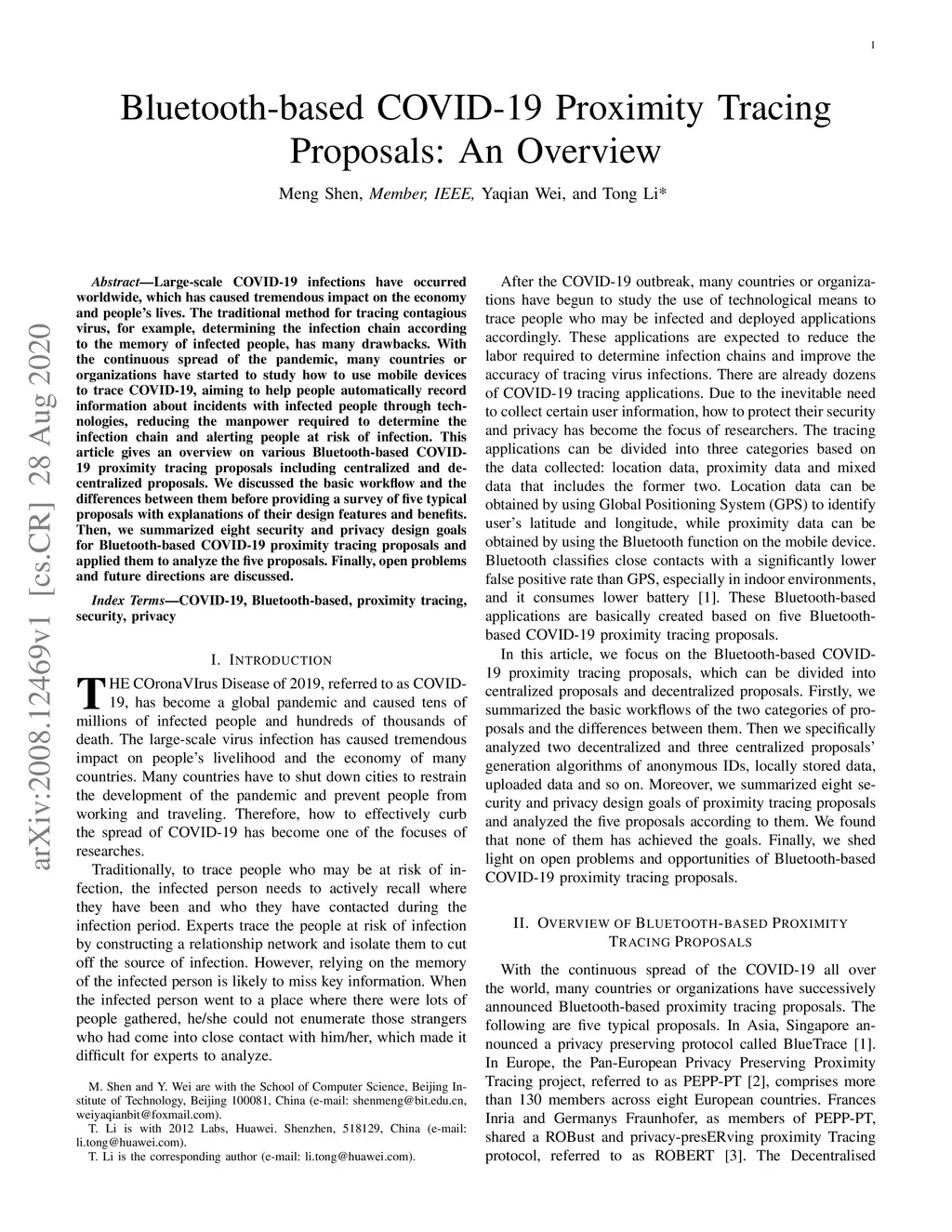 Large-scale COVID-19 infections have occurred worldwide, which has caused tremendous impact on the economy and people's lives. The traditional method for tracing contagious virus, for example, determining the infection chain according to the memory of infected people, has many drawbacks. With the continuous spread of the pandemic, many countries or organizations have started to study how to use mobile devices to trace COVID-19, aiming to help people automatically record information about incidents with infected people through technologies, reducing the manpower required to determine the infection chain and alerting people at risk of infection. This article gives an overview on various Bluetooth-based COVID-19 proximity tracing proposals including centralized and decentralized proposals. We discussed the basic workflow and the differences between them before providing a survey of five typical proposals with explanations of their design features and benefits. Then, we summarized eight security and privacy design goals for Bluetooth-based COVID-19 proximity tracing proposals and applied them to analyze the five proposals. Finally, open problems and future directions are discussed.