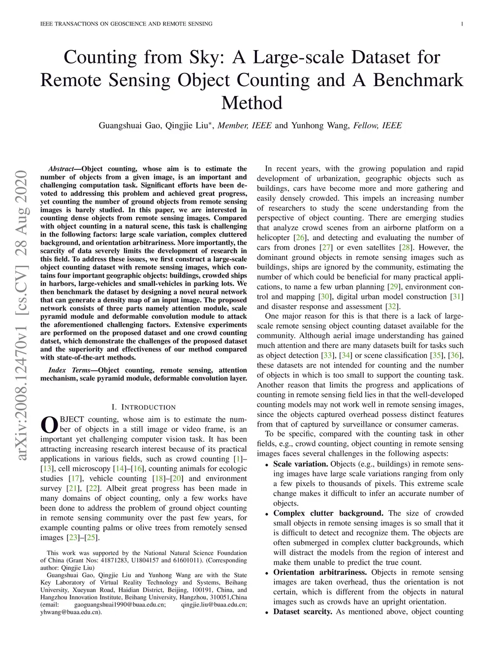 Object counting, whose aim is to estimate the number of objects from a given image, is an important and challenging computation task. Significant efforts have been devoted to addressing this problem and achieved great progress, yet counting the number of ground objects from remote sensing images is barely studied. In this paper, we are interested in counting dense objects from remote sensing images. Compared with object counting in a natural scene, this task is challenging in the following factors: large scale variation, complex cluttered background, and orientation arbitrariness. More importantly, the scarcity of data severely limits the development of research in this field. To address these issues, we first construct a large-scale object counting dataset with remote sensing images, which contains four important geographic objects: buildings, crowded ships in harbors, large-vehicles and small-vehicles in parking lots. We then benchmark the dataset by designing a novel neural network that can generate a density map of an input image. The proposed network consists of three parts namely attention module, scale pyramid module and deformable convolution module to attack the aforementioned challenging factors. Extensive experiments are performed on the proposed dataset and one crowd counting datset, which demonstrate the challenges of the proposed dataset and the superiority and effectiveness of our method compared with state-of-the-art methods.