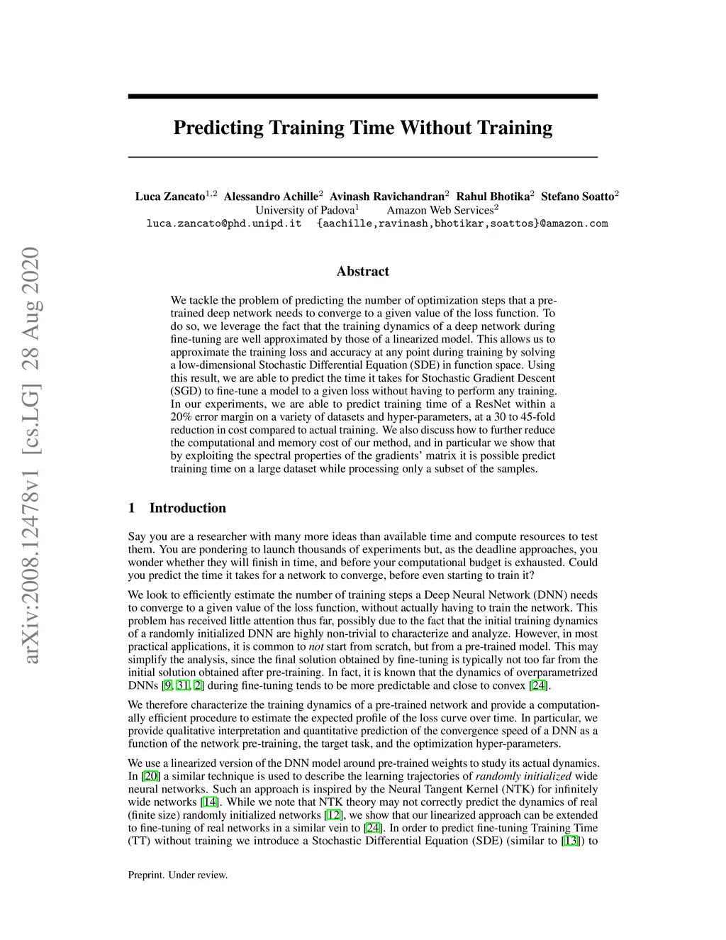 We tackle the problem of predicting the number of optimization steps that a pre-trained deep network needs to converge to a given value of the loss function. To do so, we leverage the fact that the training dynamics of a deep network during fine-tuning are well approximated by those of a linearized model. This allows us to approximate the training loss and accuracy at any point during training by solving a low-dimensional Stochastic Differential Equation (SDE) in function space. Using this result, we are able to predict the time it takes for Stochastic Gradient Descent (SGD) to fine-tune a model to a given loss without having to perform any training. In our experiments, we are able to predict training time of a ResNet within a 20% error margin on a variety of datasets and hyper-parameters, at a 30 to 45-fold reduction in cost compared to actual training. We also discuss how to further reduce the computational and memory cost of our method, and in particular we show that by exploiting the spectral properties of the gradients' matrix it is possible predict training time on a large dataset while processing only a subset of the samples.