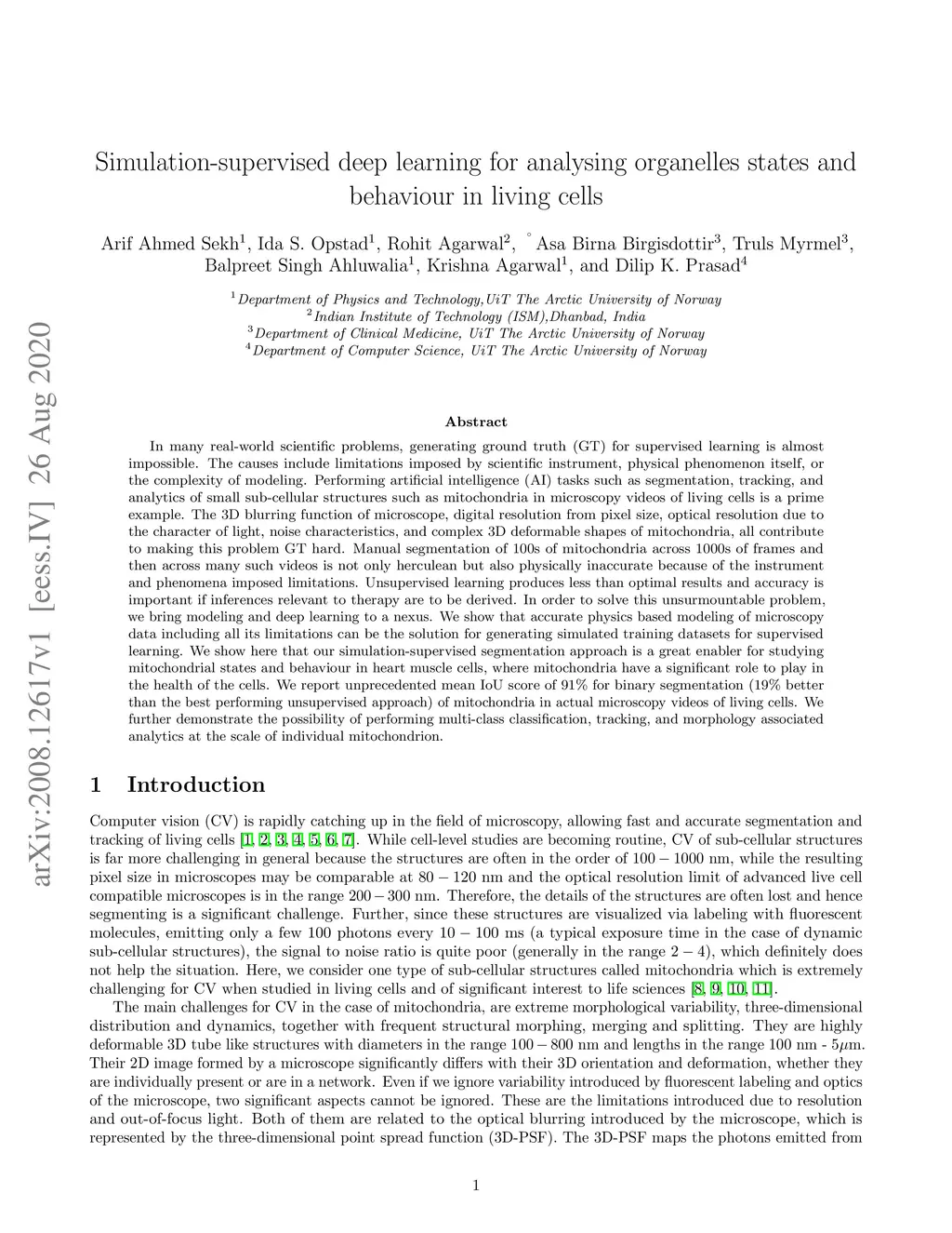 In many real-world scientific problems, generating ground truth (GT) for supervised learning is almost impossible. The causes include limitations imposed by scientific instrument, physical phenomenon itself, or the complexity of modeling. Performing artificial intelligence (AI) tasks such as segmentation, tracking, and analytics of small sub-cellular structures such as mitochondria in microscopy videos of living cells is a prime example. The 3D blurring function of microscope, digital resolution from pixel size, optical resolution due to the character of light, noise characteristics, and complex 3D deformable shapes of mitochondria, all contribute to making this problem GT hard. Manual segmentation of 100s of mitochondria across 1000s of frames and then across many such videos is not only herculean but also physically inaccurate because of the instrument and phenomena imposed limitations. Unsupervised learning produces less than optimal results and accuracy is important if inferences relevant to therapy are to be derived. In order to solve this unsurmountable problem, we bring modeling and deep learning to a nexus. We show that accurate physics based modeling of microscopy data including all its limitations can be the solution for generating simulated training datasets for supervised learning. We show here that our simulation-supervised segmentation approach is a great enabler for studying mitochondrial states and behaviour in heart muscle cells, where mitochondria have a significant role to play in the health of the cells. We report unprecedented mean IoU score of 91% for binary segmentation (19% better than the best performing unsupervised approach) of mitochondria in actual microscopy videos of living cells. We further demonstrate the possibility of performing multi-class classification, tracking, and morphology associated analytics at the scale of individual mitochondrion.