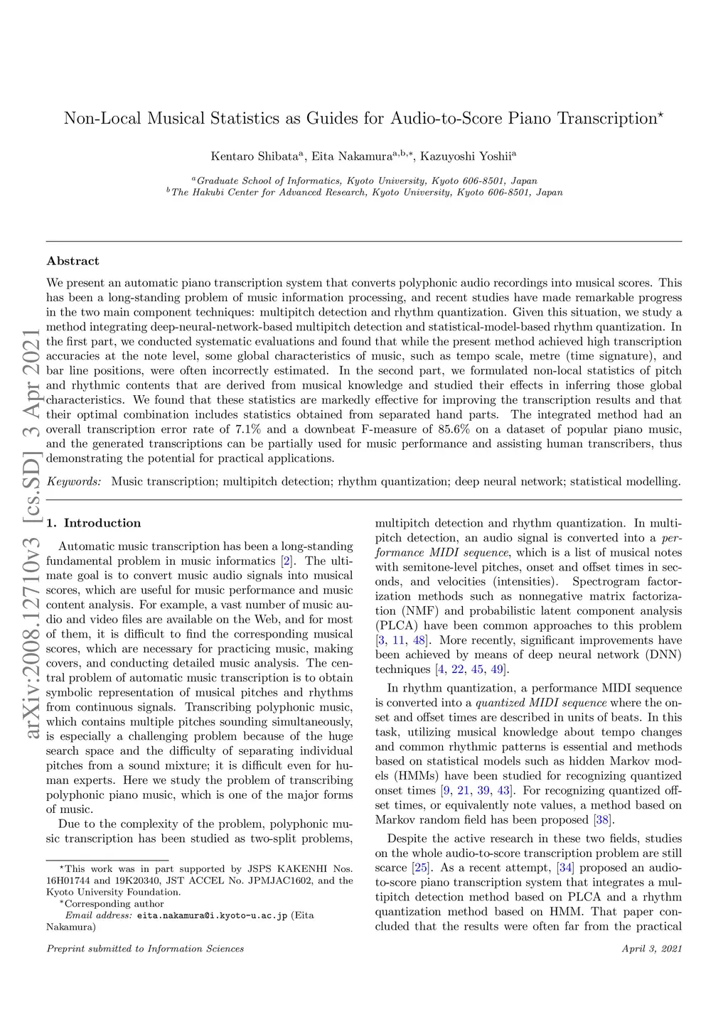 We present an automatic piano transcription system that converts polyphonic audio recordings into musical scores. This has been a long-standing problem of music information processing, and recent studies have made remarkable progress in the two main component techniques: multipitch detection and rhythm quantization. Given this situation, we study a method integrating deep-neural-network-based multipitch detection and statistical-model-based rhythm quantization. In the first part, we conducted systematic evaluations and found that while the present method achieved high transcription accuracies at the note level, some global characteristics of music, such as tempo scale, metre (time signature), and bar line positions, were often incorrectly estimated. In the second part, we formulated non-local statistics of pitch and rhythmic contents that are derived from musical knowledge and studied their effects in inferring those global characteristics. We found that these statistics are markedly effective for improving the transcription results and that their optimal combination includes statistics obtained from separated hand parts. The integrated method had an overall transcription error rate of 7.1% and a downbeat F-measure of 85.6% on a dataset of popular piano music, and the generated transcriptions can be partially used for music performance and assisting human transcribers, thus demonstrating the potential for practical applications.