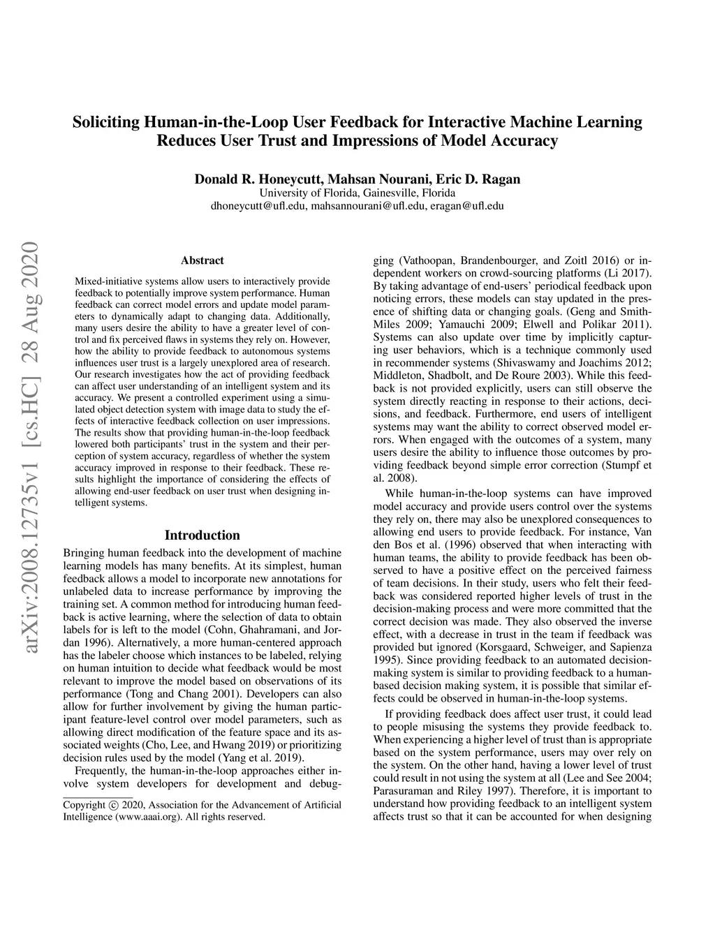 Mixed-initiative systems allow users to interactively provide feedback to potentially improve system performance. Human feedback can correct model errors and update model parameters to dynamically adapt to changing data. Additionally, many users desire the ability to have a greater level of control and fix perceived flaws in systems they rely on. However, how the ability to provide feedback to autonomous systems influences user trust is a largely unexplored area of research. Our research investigates how the act of providing feedback can affect user understanding of an intelligent system and its accuracy. We present a controlled experiment using a simulated object detection system with image data to study the effects of interactive feedback collection on user impressions. The results show that providing human-in-the-loop feedback lowered both participants' trust in the system and their perception of system accuracy, regardless of whether the system accuracy improved in response to their feedback. These results highlight the importance of considering the effects of allowing end-user feedback on user trust when designing intelligent systems.