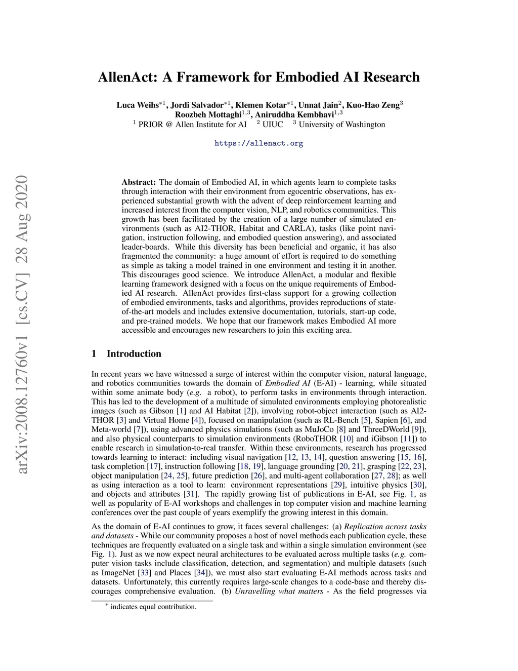 The domain of Embodied AI, in which agents learn to complete tasks through interaction with their environment from egocentric observations, has experienced substantial growth with the advent of deep reinforcement learning and increased interest from the computer vision, NLP, and robotics communities. This growth has been facilitated by the creation of a large number of simulated environments (such as AI2-THOR, Habitat and CARLA), tasks (like point navigation, instruction following, and embodied question answering), and associated leaderboards. While this diversity has been beneficial and organic, it has also fragmented the community: a huge amount of effort is required to do something as simple as taking a model trained in one environment and testing it in another. This discourages good science. We introduce AllenAct, a modular and flexible learning framework designed with a focus on the unique requirements of Embodied AI research. AllenAct provides first-class support for a growing collection of embodied environments, tasks and algorithms, provides reproductions of state-of-the-art models and includes extensive documentation, tutorials, start-up code, and pre-trained models. We hope that our framework makes Embodied AI more accessible and encourages new researchers to join this exciting area. The framework can be accessed at: https://allenact.org/