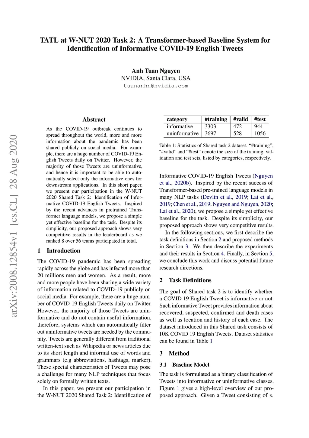 TATL at W-NUT 2020 Task 2: A Transformer-based Baseline System for