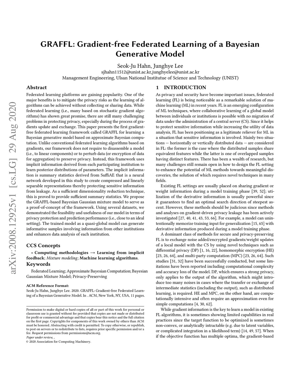 Federated learning platforms are gaining popularity. One of the major benefits is to mitigate the privacy risks as the learning of algorithms can be achieved without collecting or sharing data. While federated learning (i.e., many based on stochastic gradient algorithms) has shown great promise, there are still many challenging problems in protecting privacy, especially during the process of gradients update and exchange. This paper presents the first gradient-free federated learning framework called GRAFFL for learning a Bayesian generative model based on approximate Bayesian computation. Unlike conventional federated learning algorithms based on gradients, our framework does not require to disassemble a model (i.e., to linear components) or to perturb data (or encryption of data for aggregation) to preserve privacy. Instead, this framework uses implicit information derived from each participating institution to learn posterior distributions of parameters. The implicit information is summary statistics derived from SuffiAE that is a neural network developed in this study to create compressed and linearly separable representations thereby protecting sensitive information from leakage. As a sufficient dimensionality reduction technique, this is proved to provide sufficient summary statistics. We propose the GRAFFL-based Bayesian Gaussian mixture model to serve as a proof-of-concept of the framework. Using several datasets, we demonstrated the feasibility and usefulness of our model in terms of privacy protection and prediction performance (i.e., close to an ideal setting). The trained model as a quasi-global model can generate informative samples involving information from other institutions and enhances data analysis of each institution.