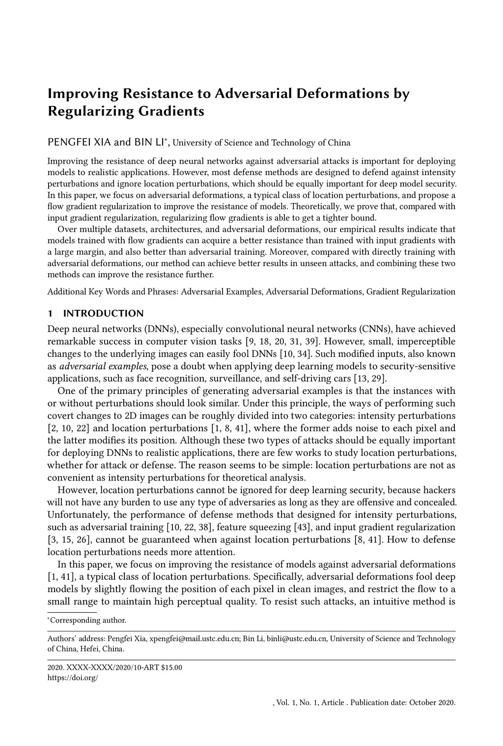 Improving the resistance of deep neural networks against adversarial attacks is important for deploying models to realistic applications. However, most defense methods are designed to defend against intensity perturbations and ignore location perturbations, which should be equally important for deep model security. In this paper, we focus on adversarial deformations, a typical class of location perturbations, and propose a flow gradient regularization to improve the resistance of models. Theoretically, we prove that, compared with input gradient regularization, regularizing flow gradients is able to get a tighter bound. Over multiple datasets, architectures, and adversarial deformations, our empirical results indicate that models trained with flow gradients can acquire a better resistance than trained with input gradients with a large margin, and also better than adversarial training. Moreover, compared with directly training with adversarial deformations, our method can achieve better results in unseen attacks, and combining these two methods can improve the resistance further.
