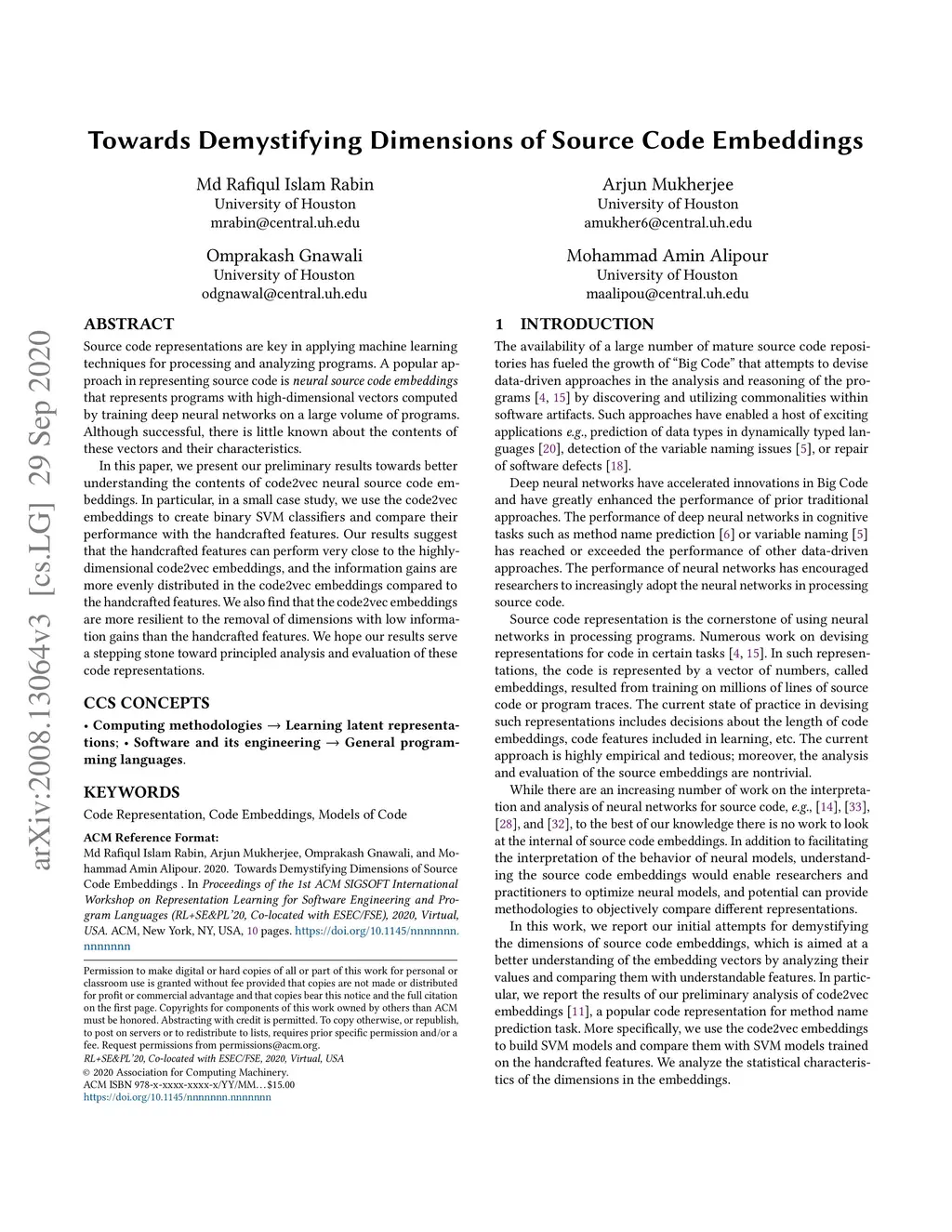 Source code representations are key in applying machine learning techniques for processing and analyzing programs. A popular approach in representing source code is neural source code embeddings that represents programs with high-dimensional vectors computed by training deep neural networks on a large volume of programs. Although successful, there is little known about the contents of these vectors and their characteristics. In this paper, we present our preliminary results towards better understanding the contents of code2vec neural source code embeddings. In particular, in a small case study, we use the code2vec embeddings to create binary SVM classifiers and compare their performance with the handcrafted features. Our results suggest that the handcrafted features can perform very close to the highly-dimensional code2vec embeddings, and the information gains are more evenly distributed in the code2vec embeddings compared to the handcrafted features. We also find that the code2vec embeddings are more resilient to the removal of dimensions with low information gains than the handcrafted features. We hope our results serve a stepping stone toward principled analysis and evaluation of these code representations.