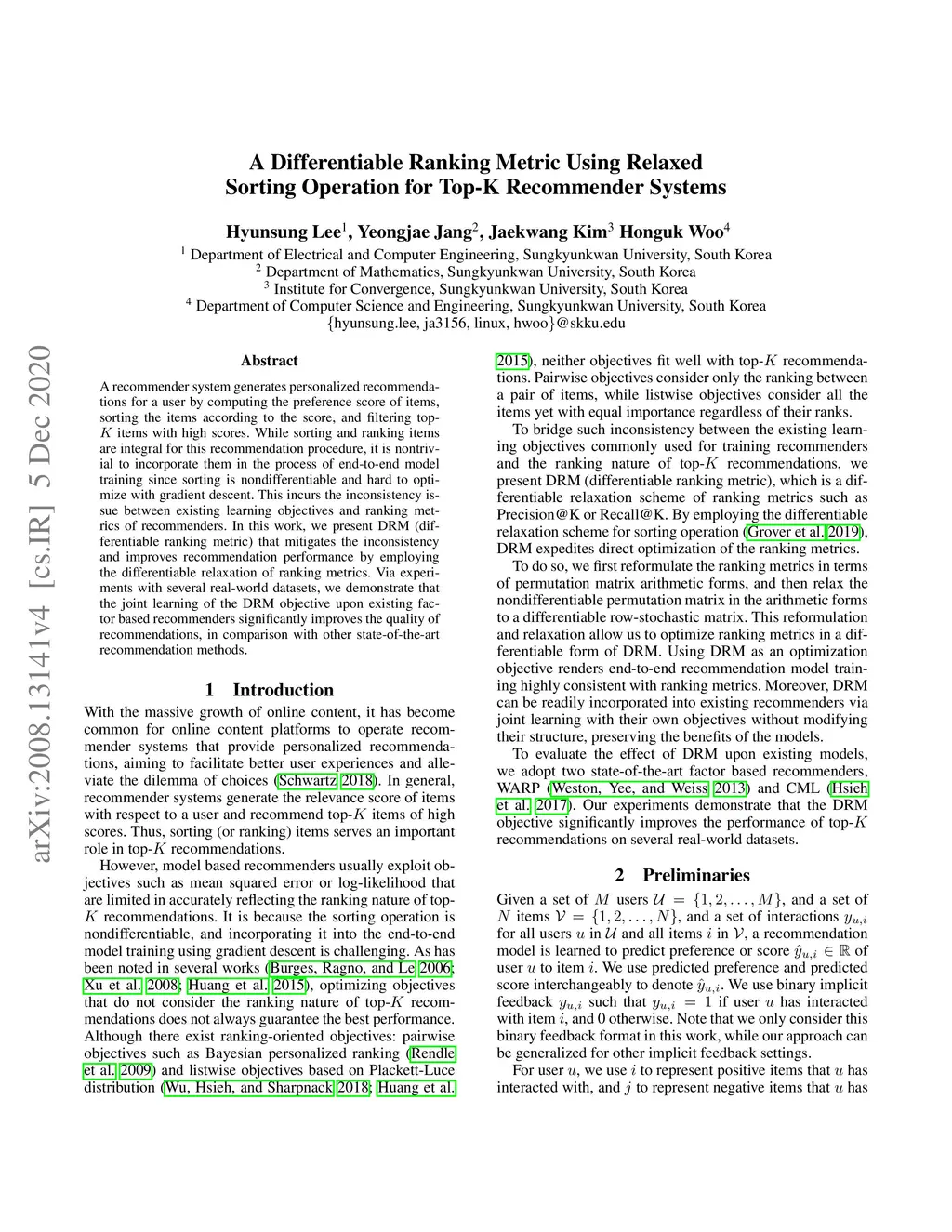 A recommender system recommends a few items for a user by sorting items according to their predicted preferences and filter items with the highest predicted preferences. While sorting and selecting top-K items are an inherent part of the personalized recommendation, it is nontrivial to incorporate them in the process of end-to-end model training since sorting is not differentiable and impossible to optimize with gradient based updates. Instead, existing recommenders optimize surrogate objectives, often rendering suboptimal quality of recommendations. In this paper, we propose the differentiable ranking metrics (DRM), a differentiable relaxation of evaluation metrics such as Precision and Recall. DRM maximizes the evaluation metrics for recommendation models directly. Via experiments with several real-world datasets, we demonstrate that the joint learning of the DRM cost function upon existing factor-based recommendation models improves the quality of recommendations significantly, in comparison with other state-of-the-art recommendation methods.
