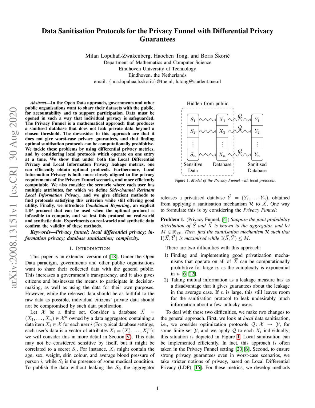 In the Open Data approach, governments and other public organisations want to share their datasets with the public, for accountability and to support participation. Data must be opened in such a way that individual privacy is safeguarded. The Privacy Funnel is a mathematical approach that produces a sanitised database that does not leak private data beyond a chosen threshold. The downsides to this approach are that it does not give worst-case privacy guarantees, and that finding optimal sanitisation protocols can be computationally prohibitive. We tackle these problems by using differential privacy metrics, and by considering local protocols which operate on one entry at a time. We show that under both the Local Differential Privacy and Local Information Privacy leakage metrics, one can efficiently obtain optimal protocols. Furthermore, Local Information Privacy is both more closely aligned to the privacy requirements of the Privacy Funnel scenario, and more efficiently computable. We also consider the scenario where each user has multiple attributes, for which we define Side-channel Resistant Local Information Privacy, and we give efficient methods to find protocols satisfying this criterion while still offering good utility. Finally, we introduce Conditional Reporting, an explicit LIP protocol that can be used when the optimal protocol is infeasible to compute, and we test this protocol on real-world and synthetic data. Experiments on real-world and synthetic data confirm the validity of these methods.