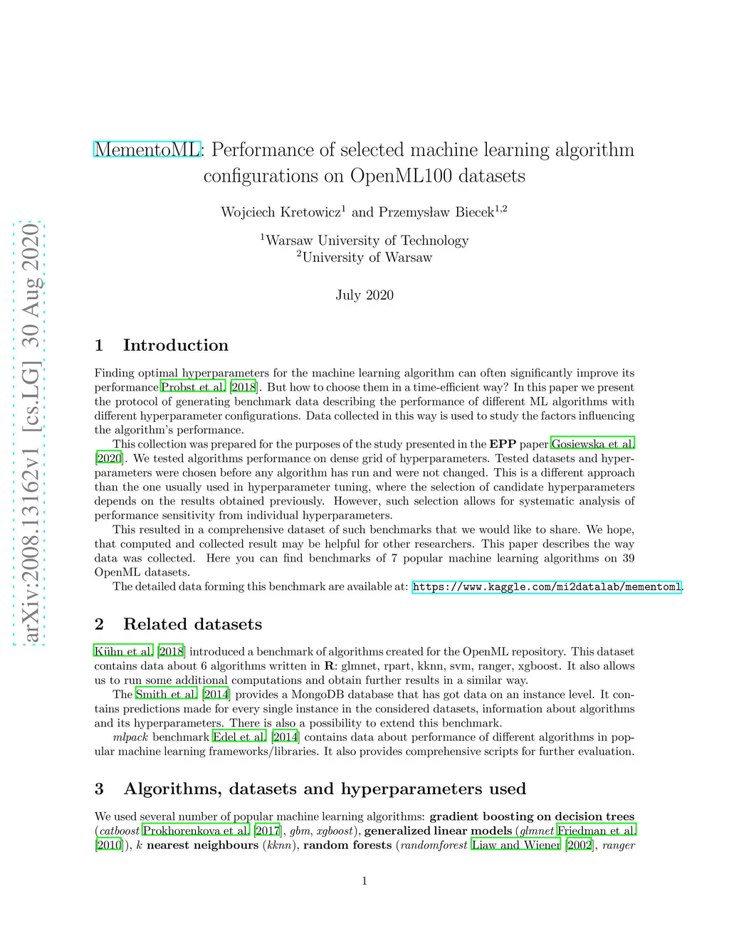 MementoML: Performance of selected machine learning algorithm