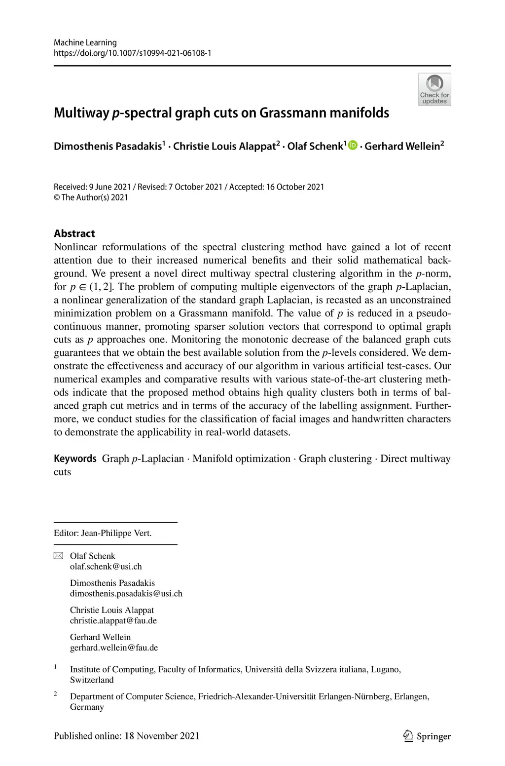 Nonlinear reformulations of the spectral clustering method have gained a lot of recent attention due to their increased numerical benefits and their solid mathematical background. We present a novel direct multiway spectral clustering algorithm in the -norm, for . The problem of computing multiple eigenvectors of the graph -Laplacian, a nonlinear generalization of the standard graph Laplacian, is recasted as an unconstrained minimization problem on a Grassmann manifold. The value of is reduced in a pseudocontinuous manner, promoting sparser solution vectors that correspond to optimal graph cuts as approaches one. Monitoring the monotonic decrease of the balanced graph cuts guarantees that we obtain the best available solution from the -levels considered. We demonstrate the effectiveness and accuracy of our algorithm in various artificial test-cases. Our numerical examples and comparative results with various state-of-the-art clustering methods indicate that the proposed method obtains high quality clusters both in terms of balanced graph cut metrics and in terms of the accuracy of the labelling assignment. Furthermore, we conduct studies for the classification of facial images and handwritten characters to demonstrate the applicability in real-world datasets.