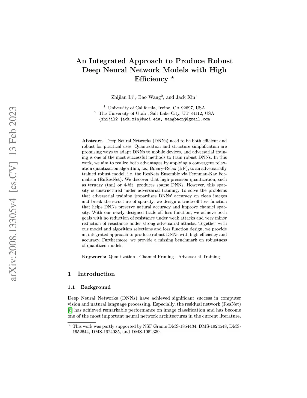 Deep Neural Networks (DNNs) needs to be both efficient and robust for practical uses. Quantization and structure simplification are promising ways to adapt DNNs to mobile devices, and adversarial training is the most popular method to make DNNs robust. In this work, we try to obtain both features by applying a convergent relaxation quantization algorithm, Binary-Relax (BR), to a robust adversarial-trained model, ResNets Ensemble via Feynman-Kac Formalism (EnResNet). We also discover that high precision, such as ternary (tnn) and 4-bit, quantization will produce sparse DNNs. However, this sparsity is unstructured under advarsarial training. To solve the problems that adversarial training jeopardizes DNNs' accuracy on clean images and the struture of sparsity, we design a trade-off loss function that helps DNNs preserve their natural accuracy and improve the channel sparsity. With our trade-off loss function, we achieve both goals with no reduction of resistance under weak attacks and very minor reduction of resistance under strong attcks. Together with quantized EnResNet with trade-off loss function, we provide robust models that have high efficiency.