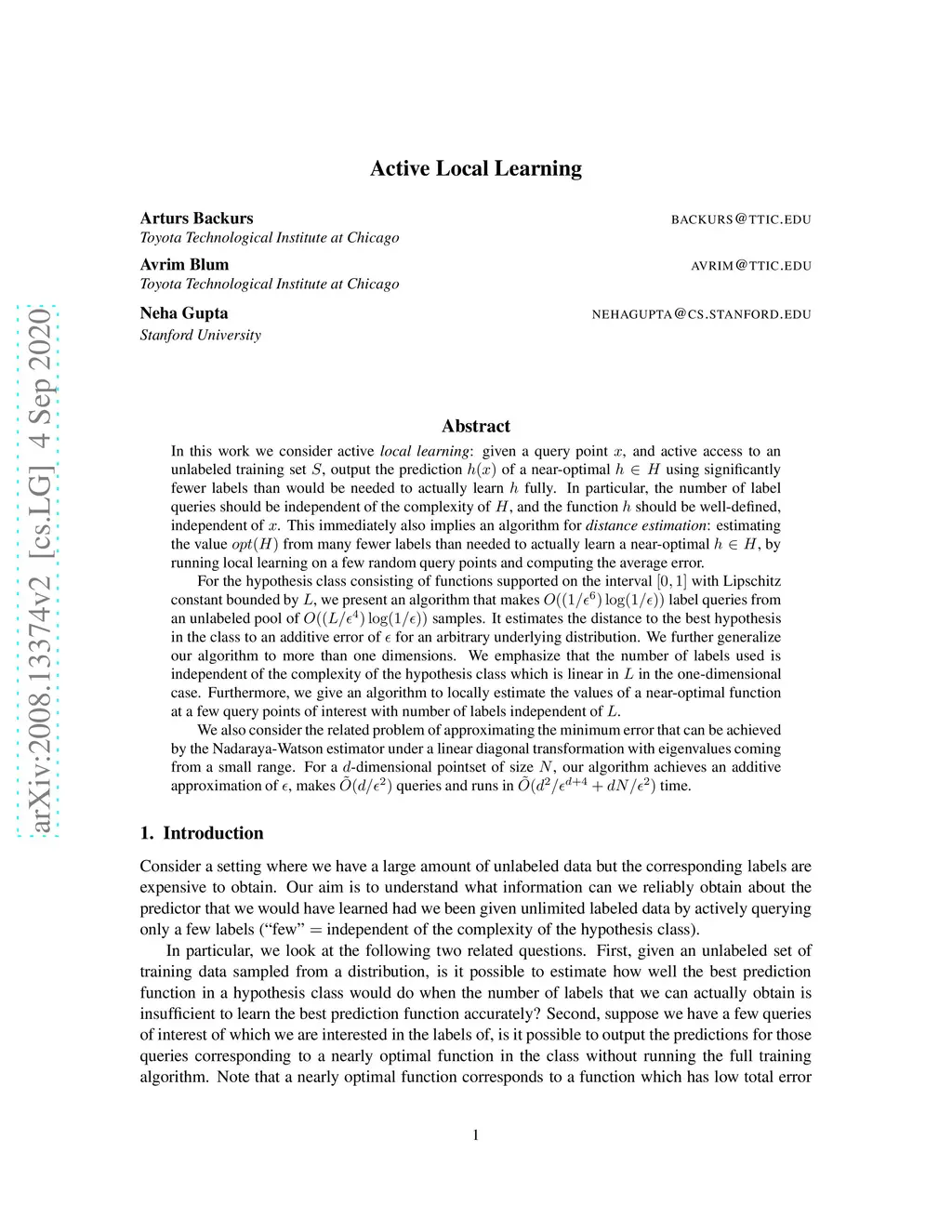 In this work we consider active local learning: given a query point , and active access to an unlabeled training set , output the prediction of a near-optimal using significantly fewer labels than would be needed to actually learn fully. In particular, the number of label queries should be independent of the complexity of , and the function should be well-defined, independent of . This immediately also implies an algorithm for distance estimation: estimating the value from many fewer labels than needed to actually learn a near-optimal , by running local learning on a few random query points and computing the average error. For the hypothesis class consisting of functions supported on the interval with Lipschitz constant bounded by , we present an algorithm that makes label queries from an unlabeled pool of samples. It estimates the distance to the best hypothesis in the class to an additive error of for an arbitrary underlying distribution. We further generalize our algorithm to more than one dimensions. We emphasize that the number of labels used is independent of the complexity of the hypothesis class which depends on . Furthermore, we give an algorithm to locally estimate the values of a near-optimal function at a few query points of interest with number of labels independent of . We also consider the related problem of approximating the minimum error that can be achieved by the Nadaraya-Watson estimator under a linear diagonal transformation with eigenvalues coming from a small range. For a -dimensional pointset of size , our algorithm achieves an additive approximation of , makes queries and runs in time.