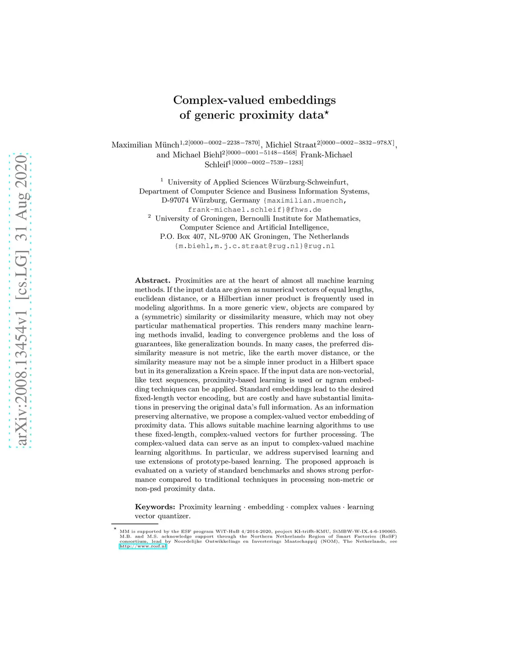 Proximities are at the heart of almost all machine learning methods. If the input data are given as numerical vectors of equal lengths, euclidean distance, or a Hilbertian inner product is frequently used in modeling algorithms. In a more generic view, objects are compared by a (symmetric) similarity or dissimilarity measure, which may not obey particular mathematical properties. This renders many machine learning methods invalid, leading to convergence problems and the loss of guarantees, like generalization bounds. In many cases, the preferred dissimilarity measure is not metric, like the earth mover distance, or the similarity measure may not be a simple inner product in a Hilbert space but in its generalization a Krein space. If the input data are non-vectorial, like text sequences, proximity-based learning is used or ngram embedding techniques can be applied. Standard embeddings lead to the desired fixed-length vector encoding, but are costly and have substantial limitations in preserving the original data's full information. As an information preserving alternative, we propose a complex-valued vector embedding of proximity data. This allows suitable machine learning algorithms to use these fixed-length, complex-valued vectors for further processing. The complex-valued data can serve as an input to complex-valued machine learning algorithms. In particular, we address supervised learning and use extensions of prototype-based learning. The proposed approach is evaluated on a variety of standard benchmarks and shows strong performance compared to traditional techniques in processing non-metric or non-psd proximity data.