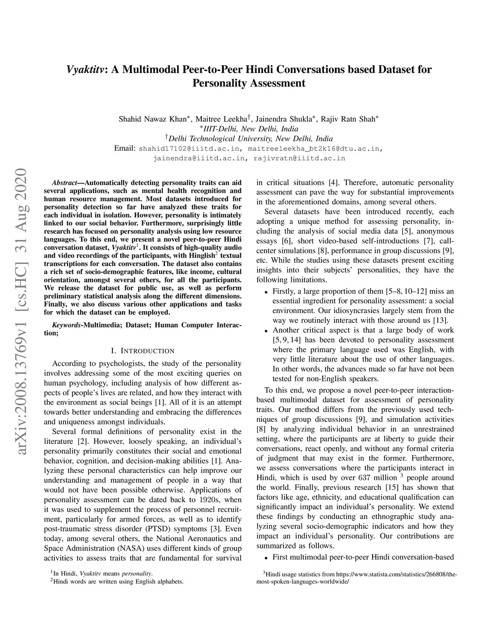 Automatically detecting personality traits can aid several applications, such as mental health recognition and human resource management. Most datasets introduced for personality detection so far have analyzed these traits for each individual in isolation. However, personality is intimately linked to our social behavior. Furthermore, surprisingly little research has focused on personality analysis using low resource languages. To this end, we present a novel peer-to-peer Hindi conversation dataset- Vyaktitv. It consists of high-quality audio and video recordings of the participants, with Hinglish textual transcriptions for each conversation. The dataset also contains a rich set of socio-demographic features, like income, cultural orientation, amongst several others, for all the participants. We release the dataset for public use, as well as perform preliminary statistical analysis along the different dimensions. Finally, we also discuss various other applications and tasks for which the dataset can be employed.