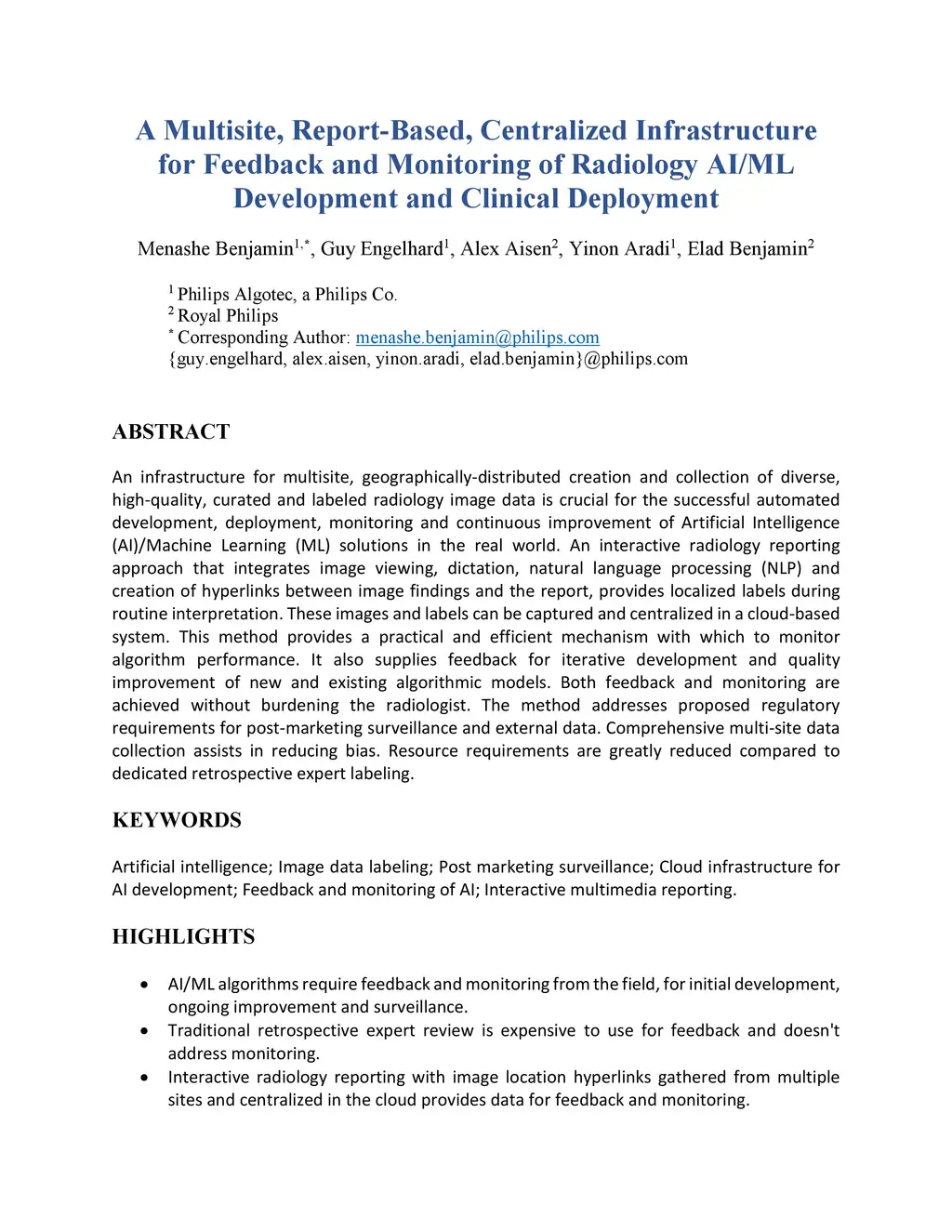 An infrastructure for multisite, geographically-distributed creation and collection of diverse, high-quality, curated and labeled radiology image data is crucial for the successful automated development, deployment, monitoring and continuous improvement of Artificial Intelligence (AI)/Machine Learning (ML) solutions in the real world. An interactive radiology reporting approach that integrates image viewing, dictation, natural language processing (NLP) and creation of hyperlinks between image findings and the report, provides localized labels during routine interpretation. These images and labels can be captured and centralized in a cloud-based system. This method provides a practical and efficient mechanism with which to monitor algorithm performance. It also supplies feedback for iterative development and quality improvement of new and existing algorithmic models. Both feedback and monitoring are achieved without burdening the radiologist. The method addresses proposed regulatory requirements for post-marketing surveillance and external data. Comprehensive multi-site data collection assists in reducing bias. Resource requirements are greatly reduced compared to dedicated retrospective expert labeling.