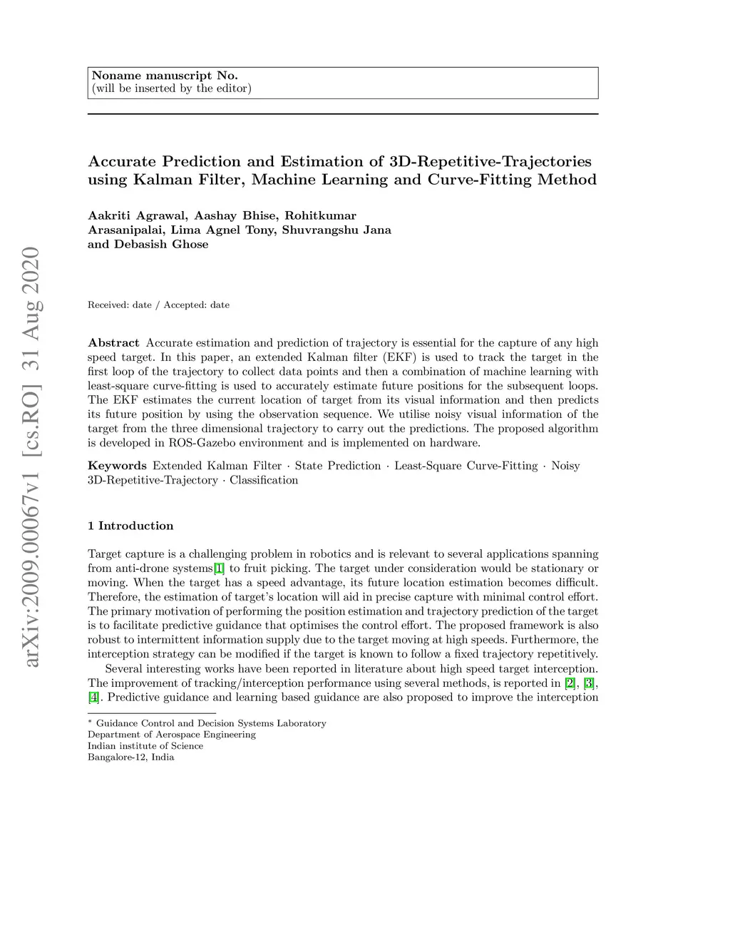 Accurate estimation and prediction of trajectory is essential for the capture of any high speed target. In this paper, an extended Kalman filter (EKF) is used to track the target in the first loop of the trajectory to collect data points and then a combination of machine learning with least-square curve-fitting is used to accurately estimate future positions for the subsequent loops. The EKF estimates the current location of target from its visual information and then predicts its future position by using the observation sequence. We utilize noisy visual information of the target from the three dimensional trajectory to carry out the predictions. The proposed algorithm is developed in ROS-Gazebo environment and is implemented on hardware.