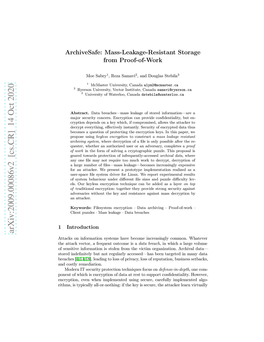 Data breaches-mass leakage of stored information-are a major security concern. Encryption can provide confidentiality, but encryption depends on a key which, if compromised, allows the attacker to decrypt everything, effectively instantly. Security of encrypted data thus becomes a question of protecting the encryption keys. In this paper, we propose using keyless encryption to construct a mass leakage resistant archiving system, where decryption of a file is only possible after the requester, whether an authorized user or an adversary, completes a proof of work in the form of solving a cryptographic puzzle. This proposal is geared towards protection of infrequently-accessed archival data, where any one file may not require too much work to decrypt, decryption of a large number of files-mass leakage-becomes increasingly expensive for an attacker. We present a prototype implementation realized as a user-space file system driver for Linux. We report experimental results of system behaviour under different file sizes and puzzle difficulty levels. Our keyless encryption technique can be added as a layer on top of traditional encryption: together they provide strong security against adversaries without the key and resistance against mass decryption by an attacker.