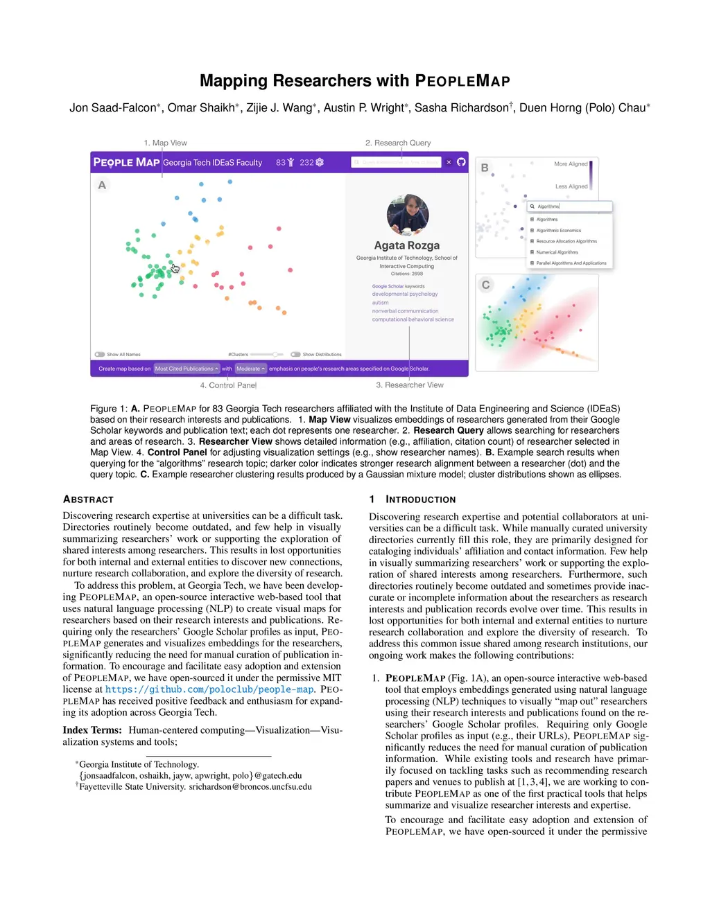 Discovering research expertise at universities can be a difficult task. Directories routinely become outdated, and few help in visually summarizing researchers' work or supporting the exploration of shared interests among researchers. This results in lost opportunities for both internal and external entities to discover new connections, nurture research collaboration, and explore the diversity of research. To address this problem, at Georgia Tech, we have been developing PeopleMap, an open-source interactive web-based tool that uses natural language processing (NLP) to create visual maps for researchers based on their research interests and publications. Requiring only the researchers' Google Scholar profiles as input, PeopleMap generates and visualizes embeddings for the researchers, significantly reducing the need for manual curation of publication information. To encourage and facilitate easy adoption and extension of PeopleMap, we have open-sourced it under the permissive MIT license at https://github.com/poloclub/people-map. PeopleMap has received positive feedback and enthusiasm for expanding its adoption across Georgia Tech.