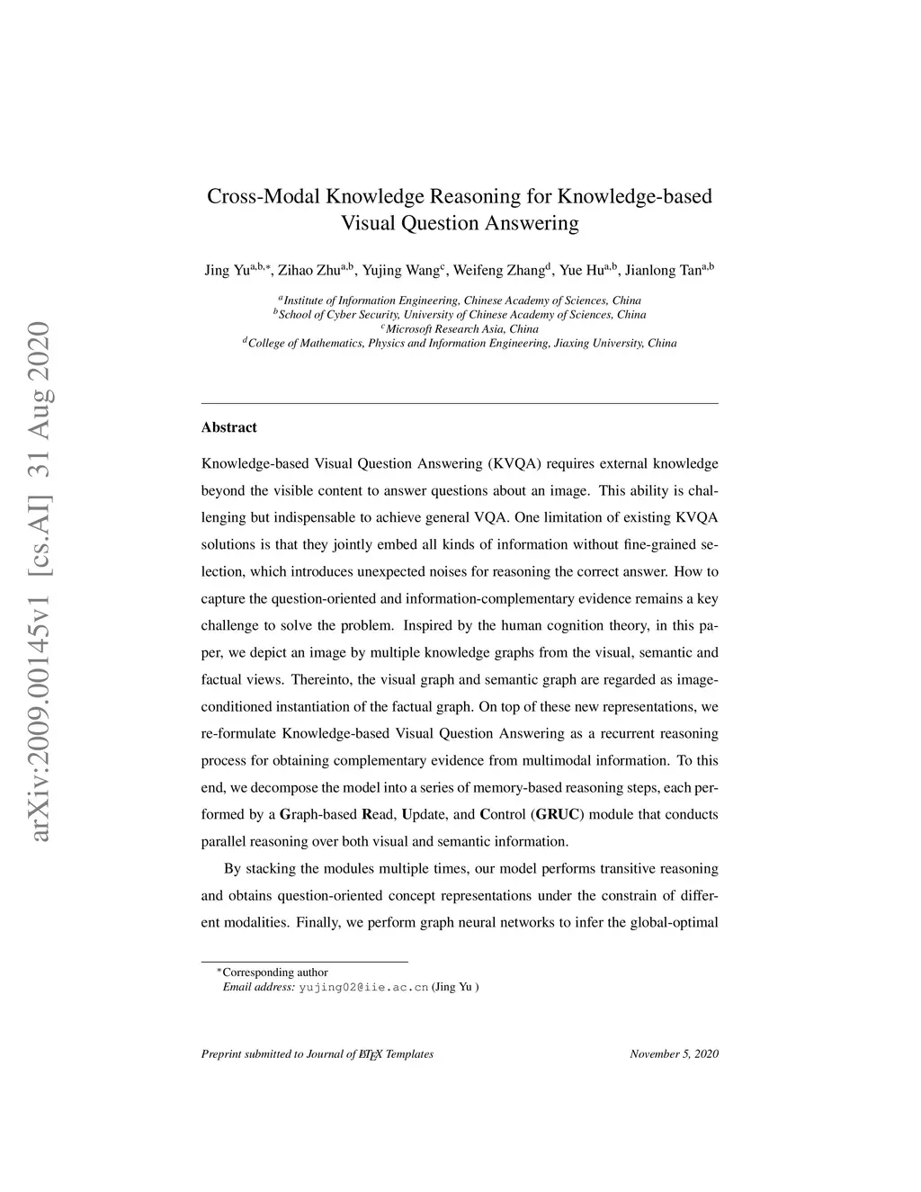 Knowledge-based Visual Question Answering (KVQA) requires external knowledge beyond the visible content to answer questions about an image. This ability is challenging but indispensable to achieve general VQA. One limitation of existing KVQA solutions is that they jointly embed all kinds of information without fine-grained selection, which introduces unexpected noises for reasoning the correct answer. How to capture the question-oriented and information-complementary evidence remains a key challenge to solve the problem. Inspired by the human cognition theory, in this paper, we depict an image by multiple knowledge graphs from the visual, semantic and factual views. Thereinto, the visual graph and semantic graph are regarded as image-conditioned instantiation of the factual graph. On top of these new representations, we re-formulate Knowledge-based Visual Question Answering as a recurrent reasoning process for obtaining complementary evidence from multimodal information. To this end, we decompose the model into a series of memory-based reasoning steps, each performed by a G raph-based R ead, U pdate, and C ontrol ( GRUC ) module that conducts parallel reasoning over both visual and semantic information. By stacking the modules multiple times, our model performs transitive reasoning and obtains question-oriented concept representations under the constrain of different modalities. Finally, we perform graph neural networks to infer the global-optimal answer by jointly considering all the concepts. We achieve a new state-of-the-art performance on three popular benchmark datasets, including FVQA, Visual7W-KB and OK-VQA, and demonstrate the effectiveness and interpretability of our model with extensive experiments.