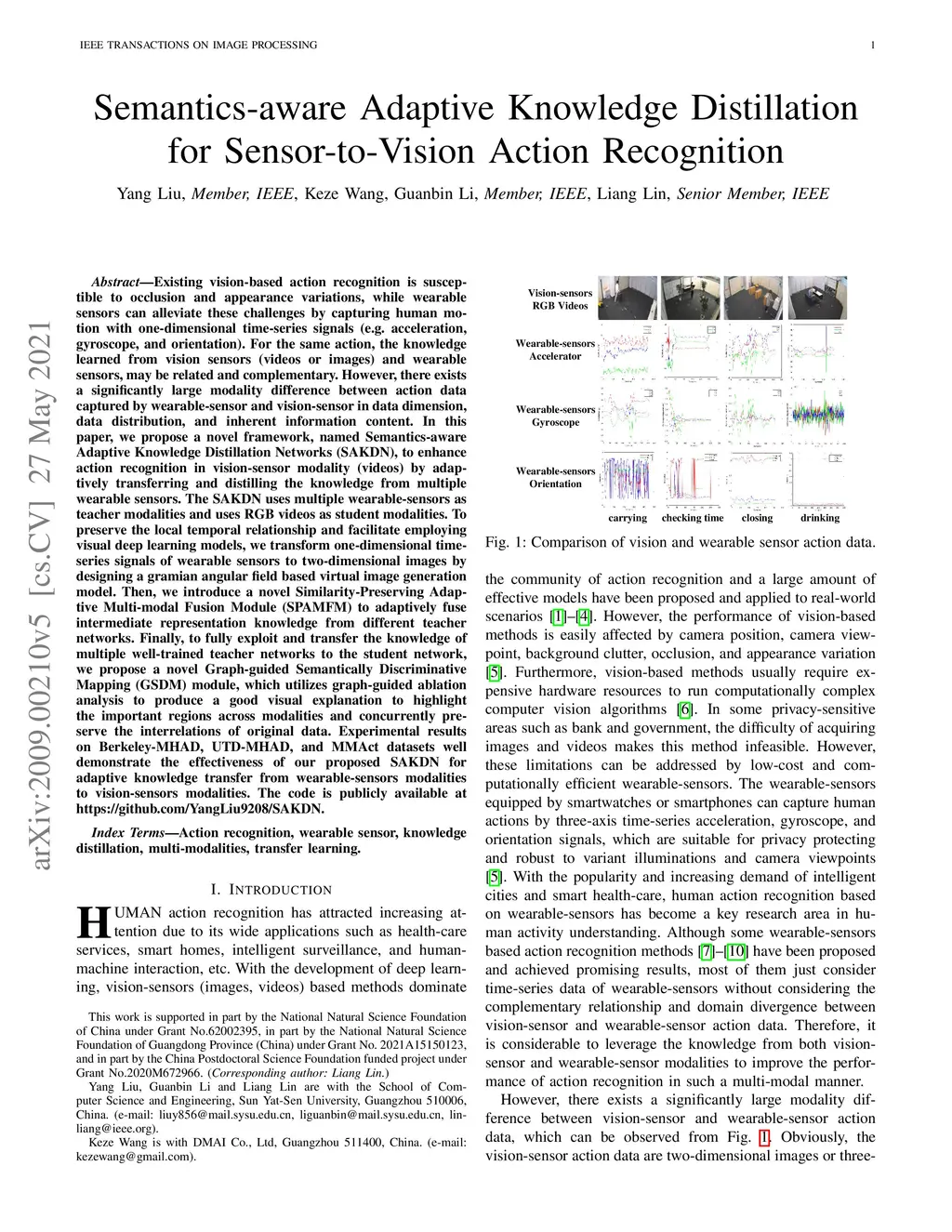 Existing vision-based action recognition is susceptible to occlusion and appearance variations, while wearable sensors can alleviate these challenges by capturing human motion with one-dimensional time-series signal. For the same action, the knowledge learned from vision sensors and wearable sensors, may be related and complementary. However, there exists significantly large modality difference between action data captured by wearable-sensor and vision-sensor in data dimension, data distribution and inherent information content. In this paper, we propose a novel framework, named Semantics-aware Adaptive Knowledge Distillation Networks (SAKDN), to enhance action recognition in vision-sensor modality (videos) by adaptively transferring and distilling the knowledge from multiple wearable sensors. The SAKDN uses multiple wearable-sensors as teacher modalities and uses RGB videos as student modality. To preserve local temporal relationship and facilitate employing visual deep learning model, we transform one-dimensional time-series signals of wearable sensors to two-dimensional images by designing a gramian angular field based virtual image generation model. Then, we build a novel Similarity-Preserving Adaptive Multi-modal Fusion Module to adaptively fuse intermediate representation knowledge from different teacher networks. Finally, to fully exploit and transfer the knowledge of multiple well-trained teacher networks to the student network, we propose a novel Graph-guided Semantically Discriminative Mapping loss, which utilizes graph-guided ablation analysis to produce a good visual explanation highlighting the important regions across modalities and concurrently preserving the interrelations of original data. Experimental results on Berkeley-MHAD, UTD-MHAD and MMAct datasets well demonstrate the effectiveness of our proposed SAKDN.