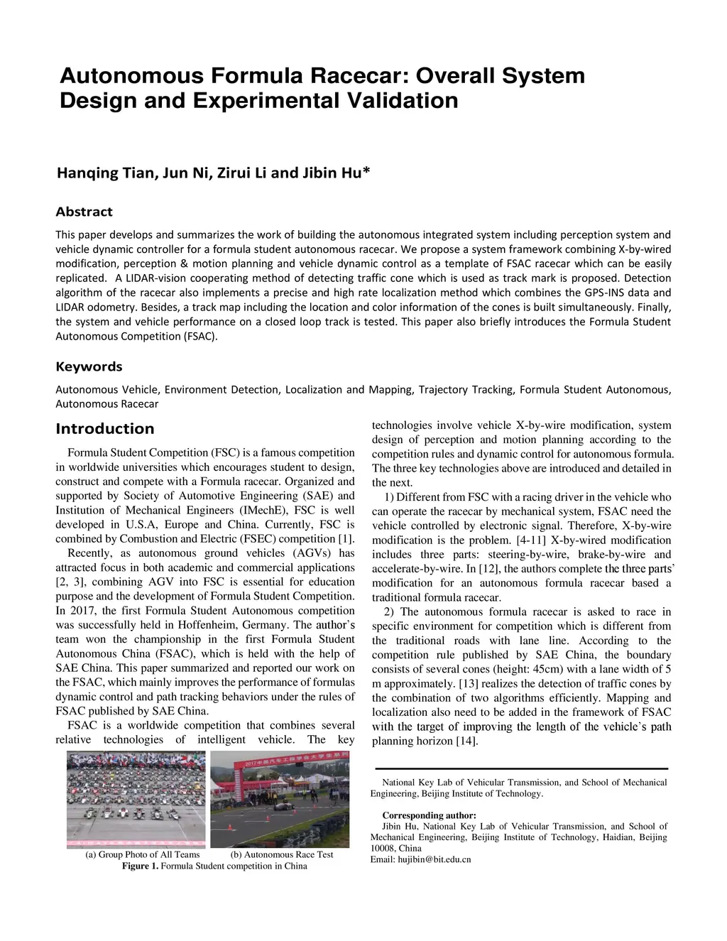 Autonomous Formula Racecar: Overall System Design and Experimental