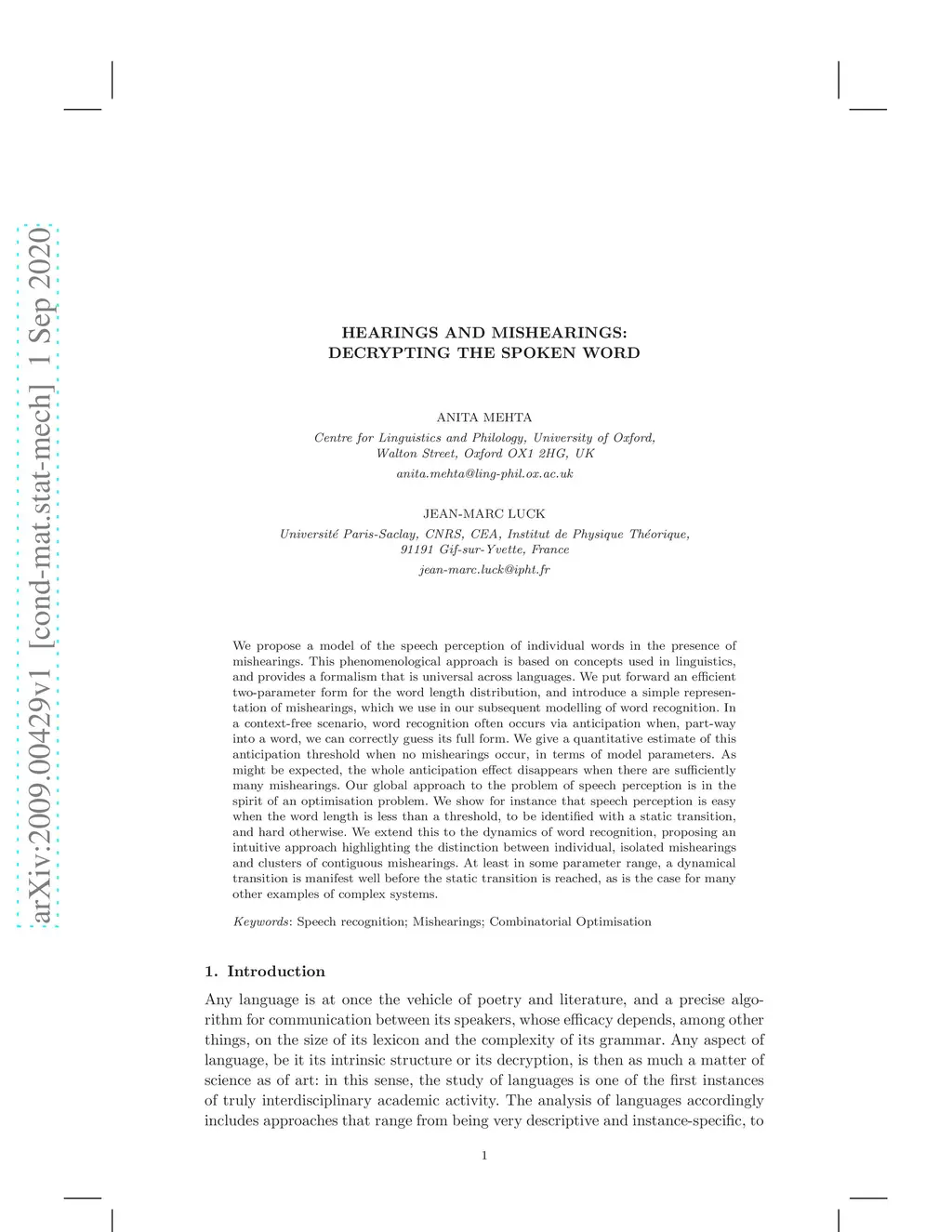 We propose a model of the speech perception of individual words in the presence of mishearings. This phenomenological approach is based on concepts used in linguistics, and provides a formalism that is universal across languages. We put forward an efficient two-parameter form for the word length distribution, and introduce a simple representation of mishearings, which we use in our subsequent modelling of word recognition. In a context-free scenario, word recognition often occurs via anticipation when, part-way into a word, we can correctly guess its full form. We give a quantitative estimate of this anticipation threshold when no mishearings occur, in terms of model parameters. As might be expected, the whole anticipation effect disappears when there are sufficiently many mishearings. Our global approach to the problem of speech perception is in the spirit of an optimisation problem. We show for instance that speech perception is easy when the word length is less than a threshold, to be identified with a static transition, and hard otherwise. We extend this to the dynamics of word recognition, proposing an intuitive approach highlighting the distinction between individual, isolated mishearings and clusters of contiguous mishearings. At least in some parameter range, a dynamical transition is manifest well before the static transition is reached, as is the case for many other examples of complex systems.