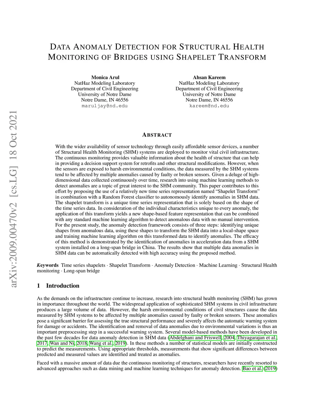With the wider availability of sensor technology, a number of Structural Health Monitoring (SHM) systems are deployed to monitor civil infrastructure. The continuous monitoring provides valuable information about the structure that can help in providing a decision support system for retrofits and other structural modifications. However, when the sensors are exposed to harsh environmental conditions, the data measured by the SHM systems tend to be affected by multiple anomalies caused by faulty or broken sensors. Given a deluge of high-dimensional data collected continuously over time, research into using machine learning methods to detect anomalies are a topic of great interest to the SHM community. This paper contributes to this effort by proposing the use of a relatively new time series representation named Shapelet Transform in combination with a Random Forest classifier to autonomously identify anomalies in SHM data. The shapelet transform is a unique time series representation that is solely based on the shape of the time series data. In consideration of the individual characteristics unique to every anomaly, the application of this transform yields a new shape-based feature representation that can be combined with any standard machine learning algorithm to detect anomalous data with no manual intervention. For the present study, the anomaly detection framework consists of three steps: identifying unique shapes from anomalous data, using these shapes to transform the SHM data into a local-shape space and training machine learning algorithm on this transformed data to identify anomalies. The efficacy of this method is demonstrated by the identification of anomalies in acceleration data from a SHM system installed on a long-span bridge in China. The results show that multiple data anomalies in SHM data can be automatically detected with high accuracy using the proposed method.