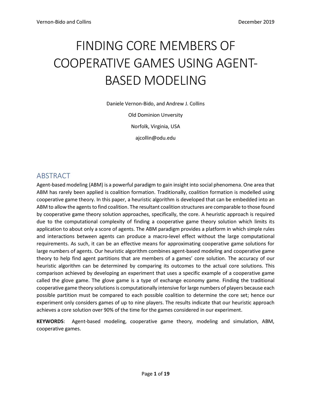 Agent-based modeling (ABM) is a powerful paradigm to gain insight into social phenomena. One area that ABM has rarely been applied is coalition formation. Traditionally, coalition formation is modeled using cooperative game theory. In this paper, a heuristic algorithm is developed that can be embedded into an ABM to allow the agents to find coalition. The resultant coalition structures are comparable to those found by cooperative game theory solution approaches, specifically, the core. A heuristic approach is required due to the computational complexity of finding a cooperative game theory solution which limits its application to about only a score of agents. The ABM paradigm provides a platform in which simple rules and interactions between agents can produce a macro-level effect without the large computational requirements. As such, it can be an effective means for approximating cooperative game solutions for large numbers of agents. Our heuristic algorithm combines agent-based modeling and cooperative game theory to help find agent partitions that are members of a games' core solution. The accuracy of our heuristic algorithm can be determined by comparing its outcomes to the actual core solutions. This comparison achieved by developing an experiment that uses a specific example of a cooperative game called the glove game. The glove game is a type of exchange economy game. Finding the traditional cooperative game theory solutions is computationally intensive for large numbers of players because each possible partition must be compared to each possible coalition to determine the core set; hence our experiment only considers games of up to nine players. The results indicate that our heuristic approach achieves a core solution over 90% of the time for the games considered in our experiment.