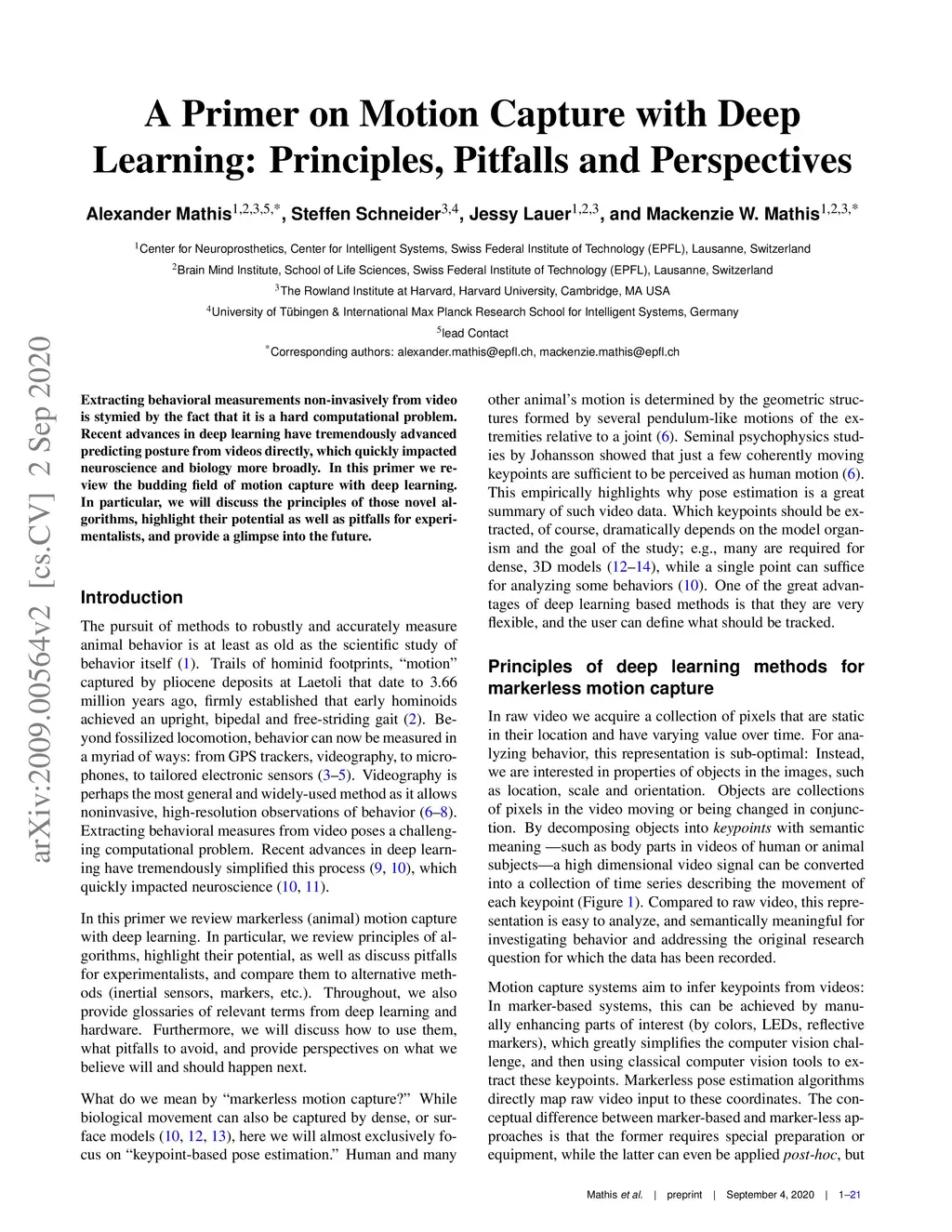 Extracting behavioral measurements non-invasively from video is stymied by the fact that it is a hard computational problem. Recent advances in deep learning have tremendously advanced predicting posture from videos directly, which quickly impacted neuroscience and biology more broadly. In this primer we review the budding field of motion capture with deep learning. In particular, we will discuss the principles of those novel algorithms, highlight their potential as well as pitfalls for experimentalists, and provide a glimpse into the future.