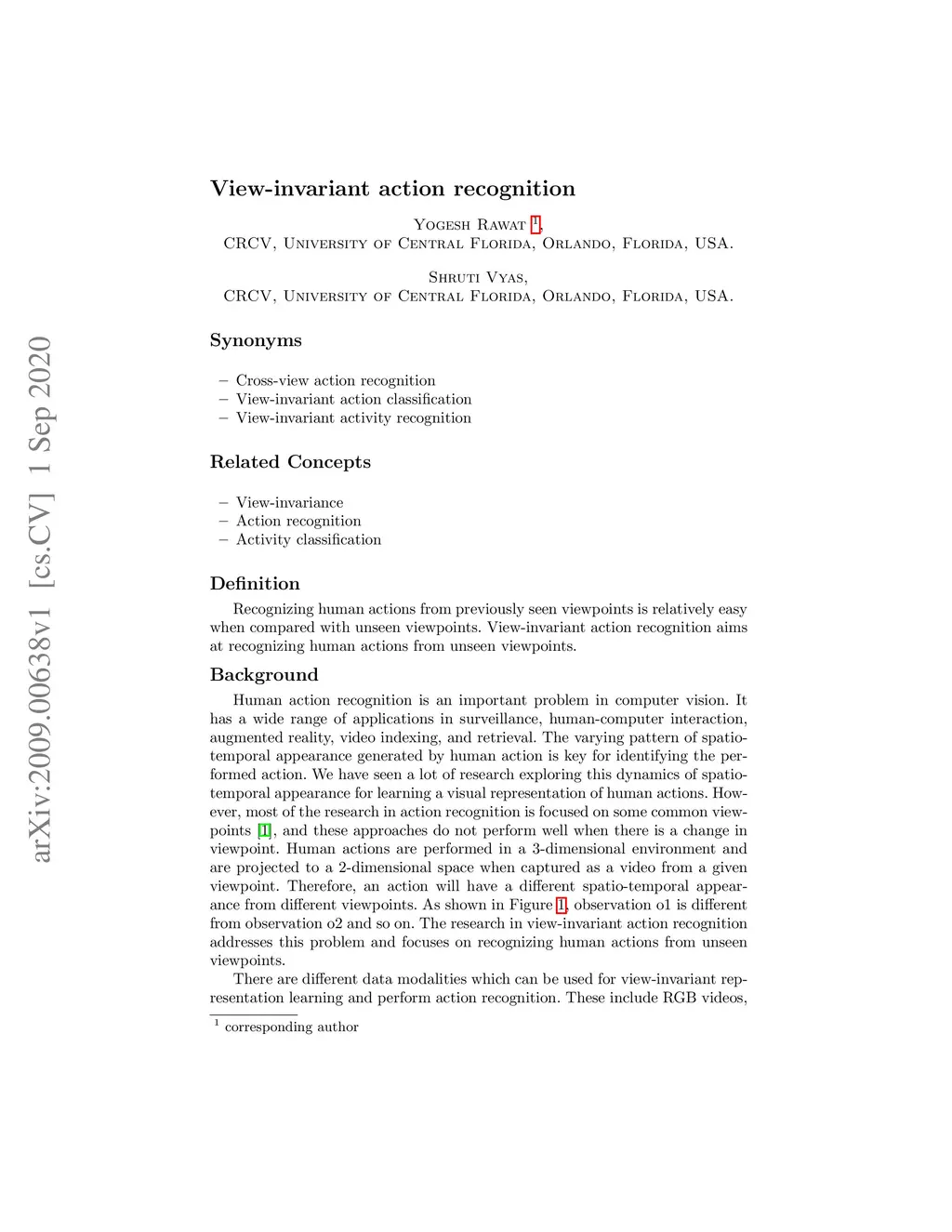 Human action recognition is an important problem in computer vision. It has a wide range of applications in surveillance, human-computer interaction, augmented reality, video indexing, and retrieval. The varying pattern of spatio-temporal appearance generated by human action is key for identifying the performed action. We have seen a lot of research exploring this dynamics of spatio-temporal appearance for learning a visual representation of human actions. However, most of the research in action recognition is focused on some common viewpoints, and these approaches do not perform well when there is a change in viewpoint. Human actions are performed in a 3-dimensional environment and are projected to a 2-dimensional space when captured as a video from a given viewpoint. Therefore, an action will have a different spatio-temporal appearance from different viewpoints. The research in view-invariant action recognition addresses this problem and focuses on recognizing human actions from unseen viewpoints.