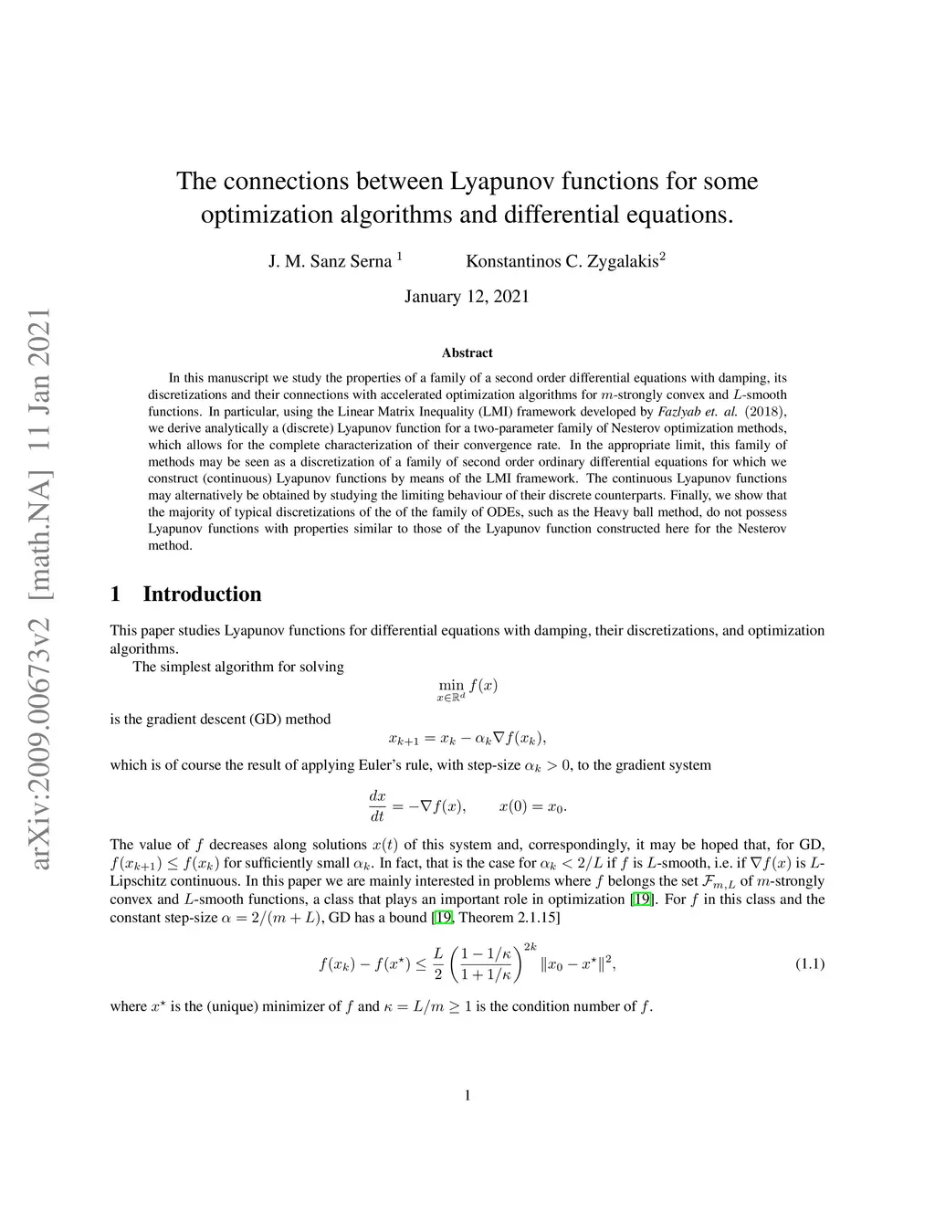 In this manuscript we study the properties of a family of a second order differential equations with damping, its discretizations and their connections with accelerated optimization algorithms for -strongly convex and -smooth functions. In particular, using the Linear Matrix Inequality framework developed in \emph{Fazlyab et. al. }, we derive analytically a (discrete) Lyapunov function for a two-parameter family of Nesterov optimization methods, which allows for a complete characterization of their convergence rate. We then show that in the appropriate limit this family of methods may be seen as a discretization of a family of second order ordinary differential equations, which properties can be also understood by a (continuous) Lyapunov function, which can also be obtained by studying the limiting behaviour of the discrete Lyapunov function. Finally, we show that the majority of typical discretizations of this ODE, such as the Heavy ball method, do not possess suitable discrete Lyapunov functions, and hence fail to reproduce the desired limiting behaviour of this ODE, which in turn implies that their converge rates when seen as optimization methods cannot behave in an "accerelated" manner .