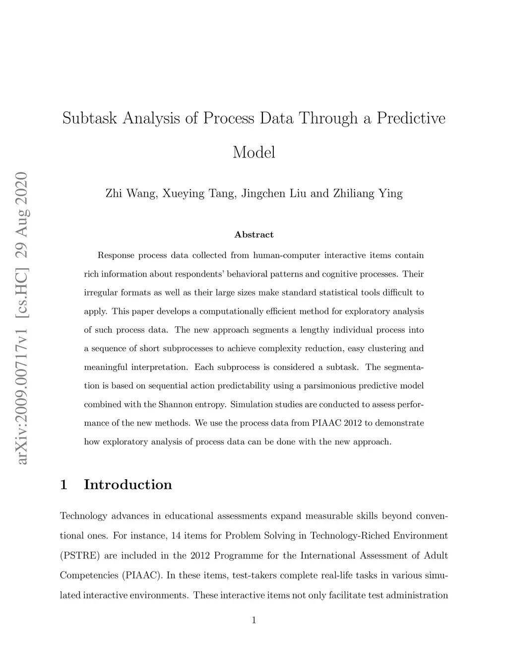 Response process data collected from human-computer interactive items contain rich information about respondents' behavioral patterns and cognitive processes. Their irregular formats as well as their large sizes make standard statistical tools difficult to apply. This paper develops a computationally efficient method for exploratory analysis of such process data. The new approach segments a lengthy individual process into a sequence of short subprocesses to achieve complexity reduction, easy clustering and meaningful interpretation. Each subprocess is considered a subtask. The segmentation is based on sequential action predictability using a parsimonious predictive model combined with the Shannon entropy. Simulation studies are conducted to assess performance of the new methods. We use the process data from PIAAC 2012 to demonstrate how exploratory analysis of process data can be done with the new approach.