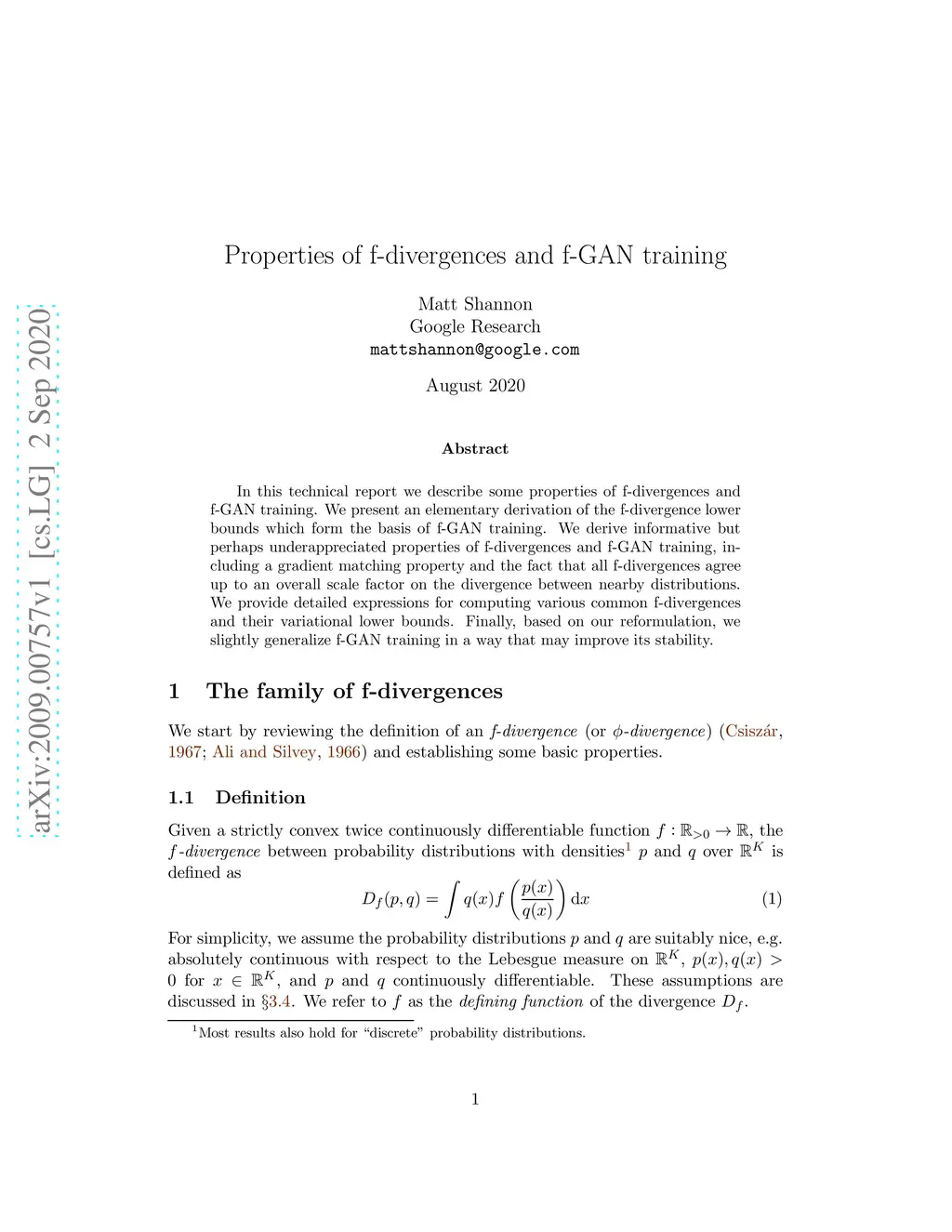 In this technical report we describe some properties of f-divergences and f-GAN training. We present an elementary derivation of the f-divergence lower bounds which form the basis of f-GAN training. We derive informative but perhaps underappreciated properties of f-divergences and f-GAN training, including a gradient matching property and the fact that all f-divergences agree up to an overall scale factor on the divergence between nearby distributions. We provide detailed expressions for computing various common f-divergences and their variational lower bounds. Finally, based on our reformulation, we slightly generalize f-GAN training in a way that may improve its stability.