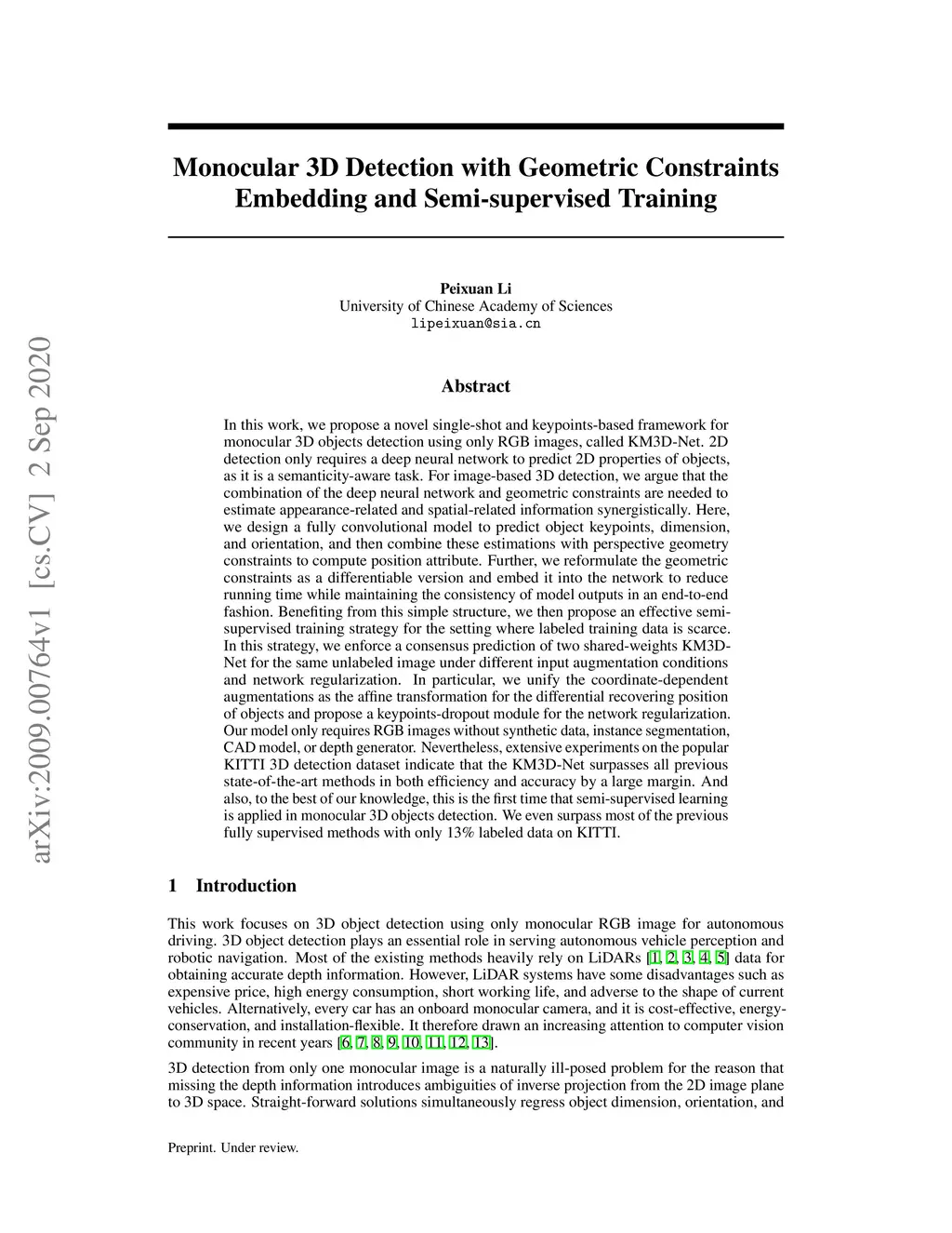 In this work, we propose a novel single-shot and keypoints-based framework for monocular 3D objects detection using only RGB images, called KM3D-Net. We design a fully convolutional model to predict object keypoints, dimension, and orientation, and then combine these estimations with perspective geometry constraints to compute position attribute. Further, we reformulate the geometric constraints as a differentiable version and embed it into the network to reduce running time while maintaining the consistency of model outputs in an end-to-end fashion. Benefiting from this simple structure, we then propose an effective semi-supervised training strategy for the setting where labeled training data is scarce. In this strategy, we enforce a consensus prediction of two shared-weights KM3D-Net for the same unlabeled image under different input augmentation conditions and network regularization. In particular, we unify the coordinate-dependent augmentations as the affine transformation for the differential recovering position of objects and propose a keypoints-dropout module for the network regularization. Our model only requires RGB images without synthetic data, instance segmentation, CAD model, or depth generator. Nevertheless, extensive experiments on the popular KITTI 3D detection dataset indicate that the KM3D-Net surpasses all previous state-of-the-art methods in both efficiency and accuracy by a large margin. And also, to the best of our knowledge, this is the first time that semi-supervised learning is applied in monocular 3D objects detection. We even surpass most of the previous fully supervised methods with only 13\% labeled data on KITTI.